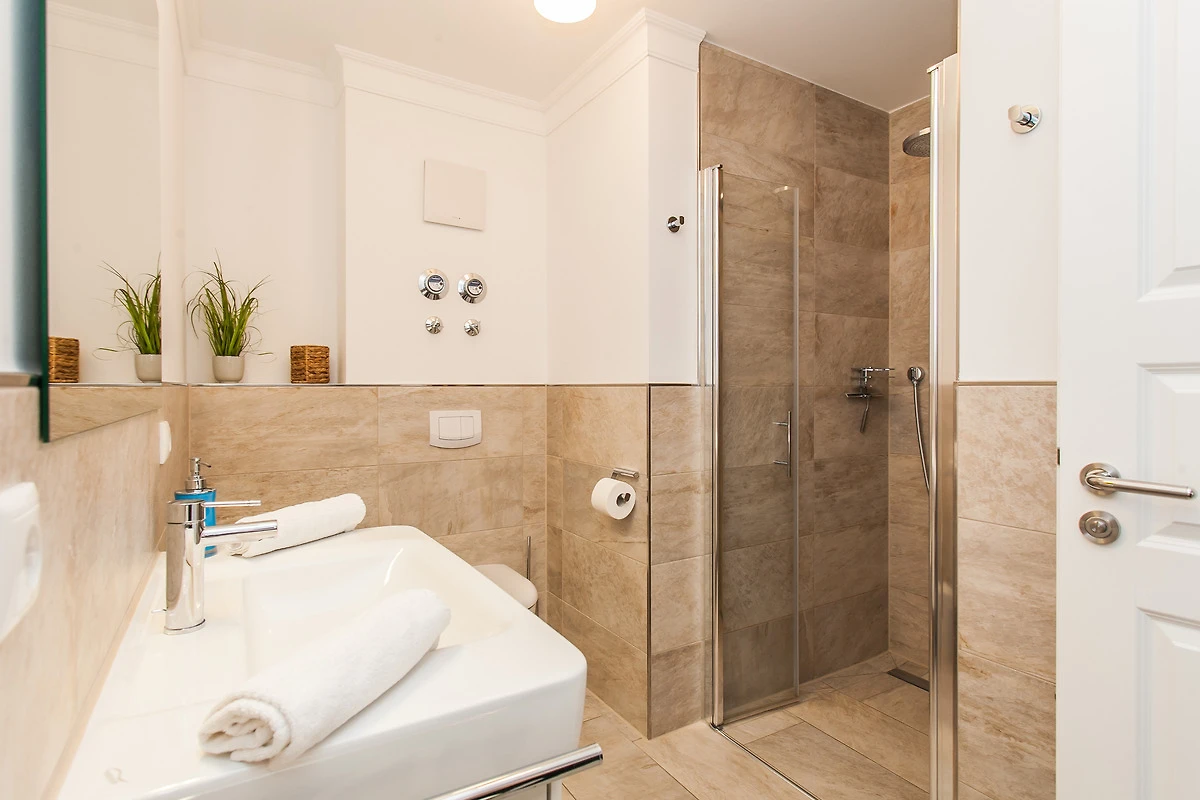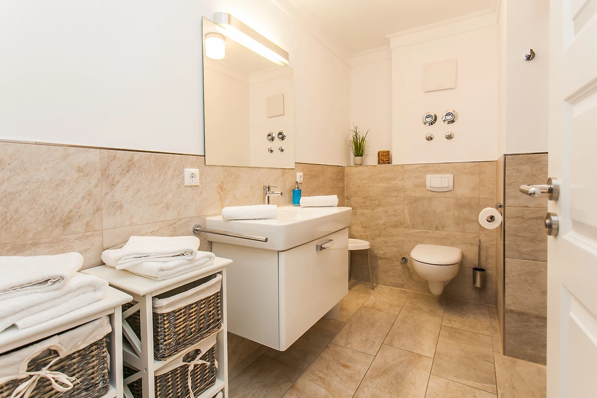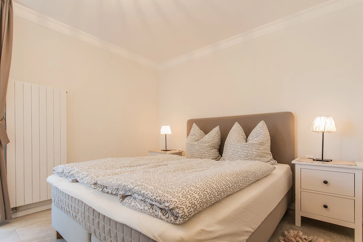 Die Ferienwohnung ist ausgestattet mit einem Wohnraum mit Schlafsofa (ca.1,20m x 2,00 m), einer komplett eingerichteten Küchenzeile inkl. Nespressomaschine. Einem Schlafzimmer mit Boxspringbett (1,60 m x 2,00 m) und einem Badezimmer mit ebenerdiger Dusche (Regendusche und Handbrause) und WC.
