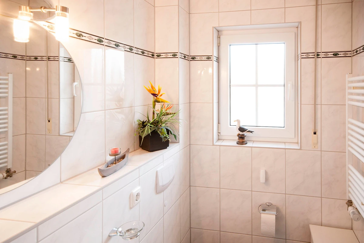 Bad mit Dusche und WC und einem Gäste - WC. Zur weiteren Ausstattung gehören ein Sat-TV, ein DVD Player und eine Stereoanlage. Kinderreisebett und Kinderhochstuhl stehen kostenfrei zur Verfügung.