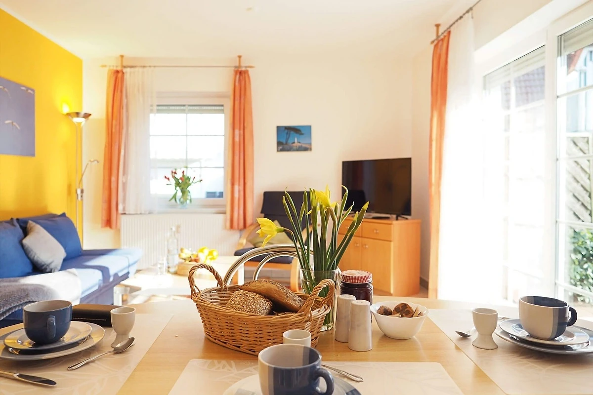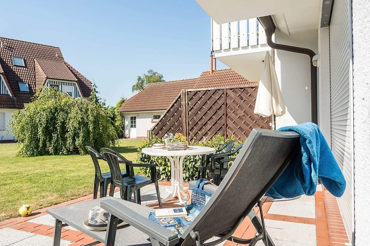 Die Wohnung liegt im Erdgeschoss und besitzt eine Südterrasse mit Gartenmöbeln.