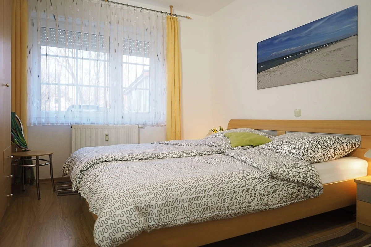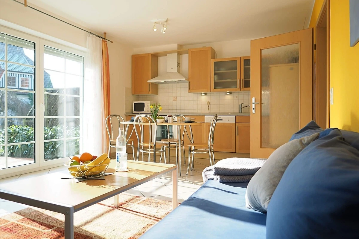 Sie ist ausgestattet mit zwei Schlafräumen (1x1 Doppelbett, 1x1 Einzelbett), einem Wohnbereich mit einer Küchenzeile und einem Bad