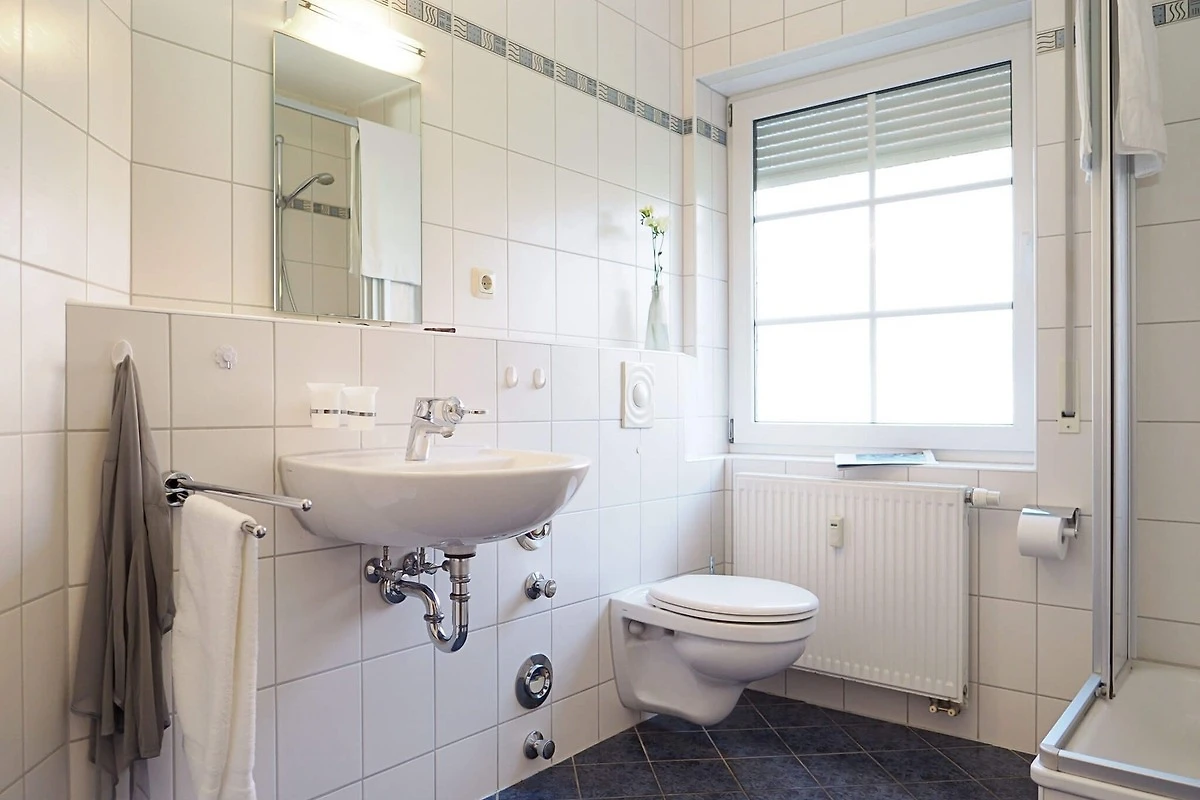 mit Dusche und WC. Zur weiteren Einrichtung gehören ein Satelliten - TV und ein Radio.