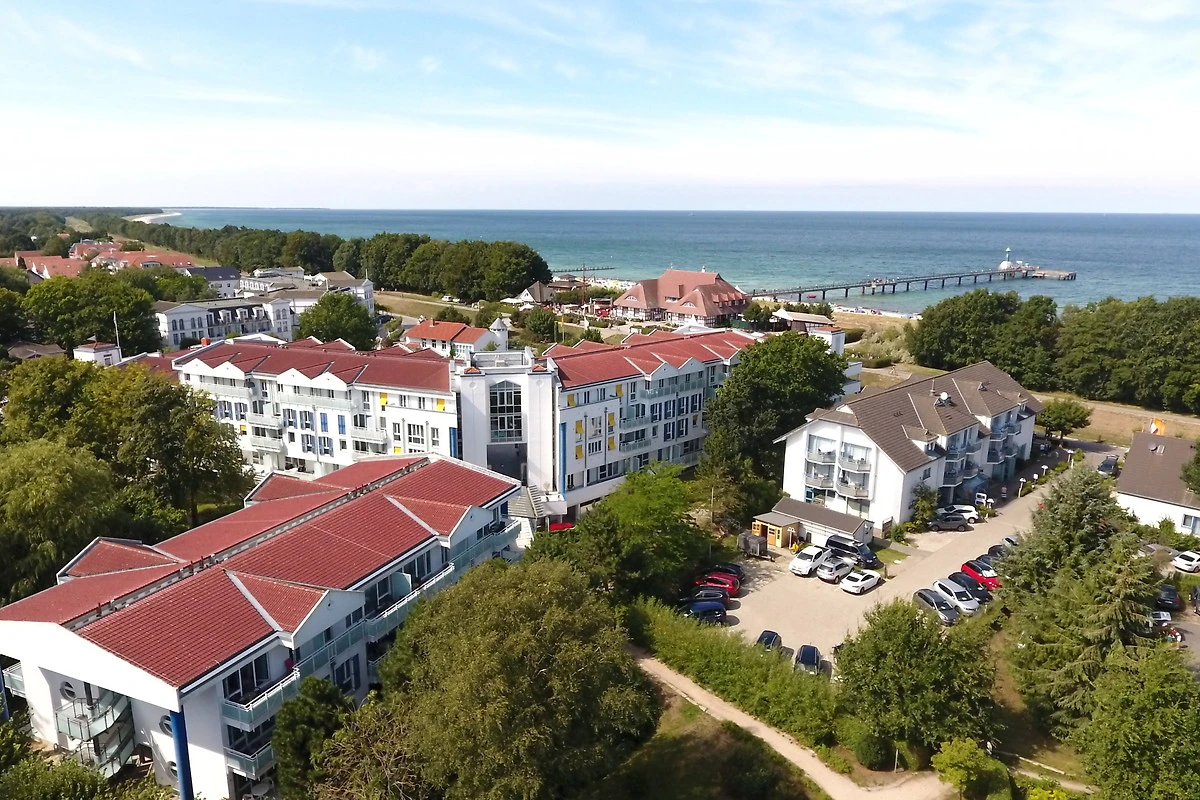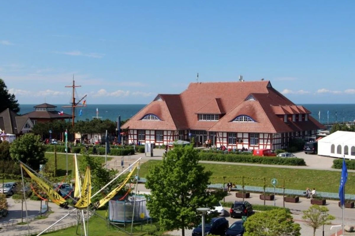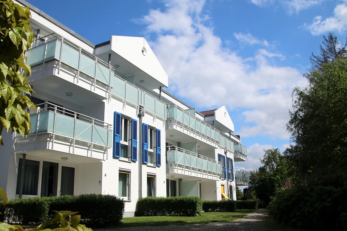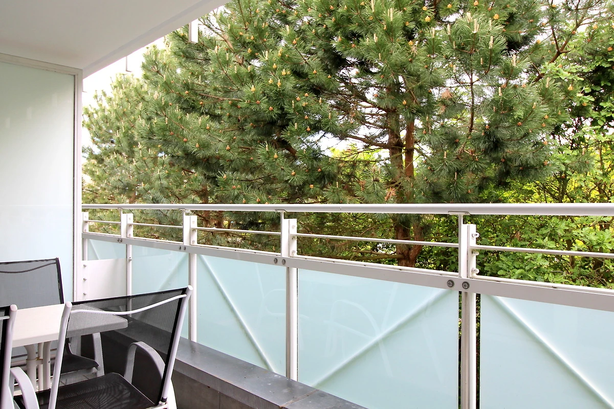 Auf dem Balkon mit Blick in den Martha-Müller-Grählert-Park können Sie bei Ruhe und Sonne das Frühstück geniessen oder einfach entspannen. Zur Verfügung stehen Ihnen natürlich Balkonmöbel. Zugehörig zum Appartement ist ebenfalls ein für Zingst unerlässlicher Pkw-Stellplatz (bis 1,90 Meter Höhe) in der Tiefgarage.