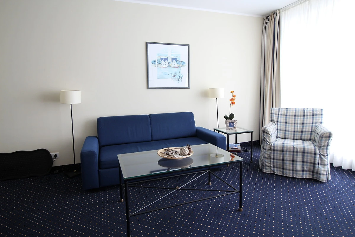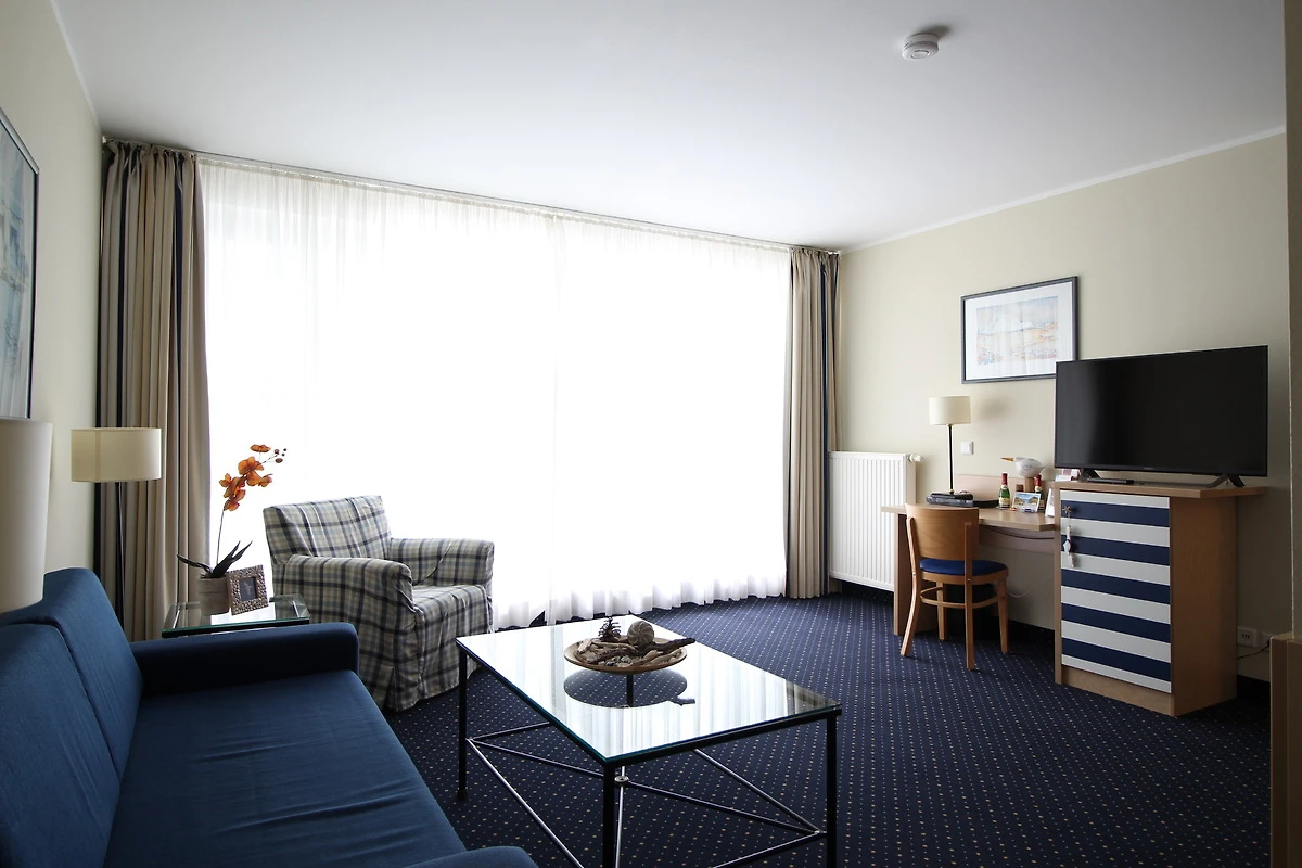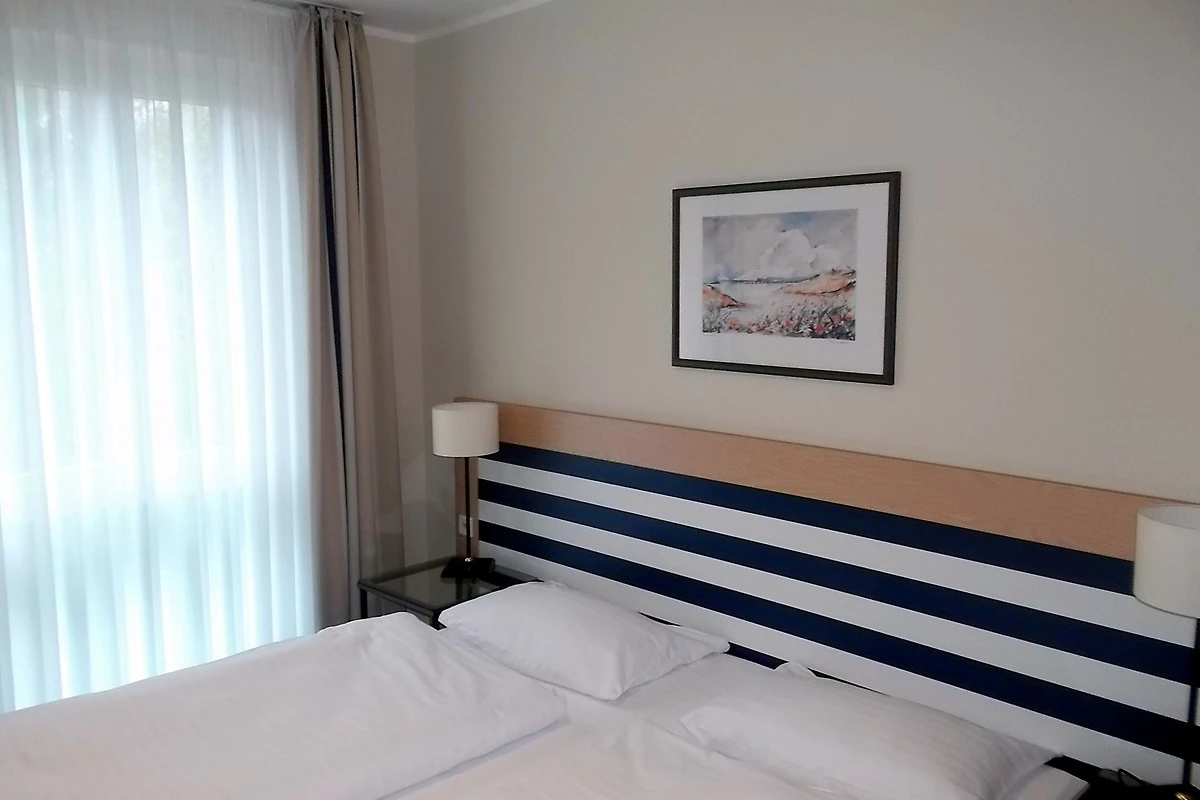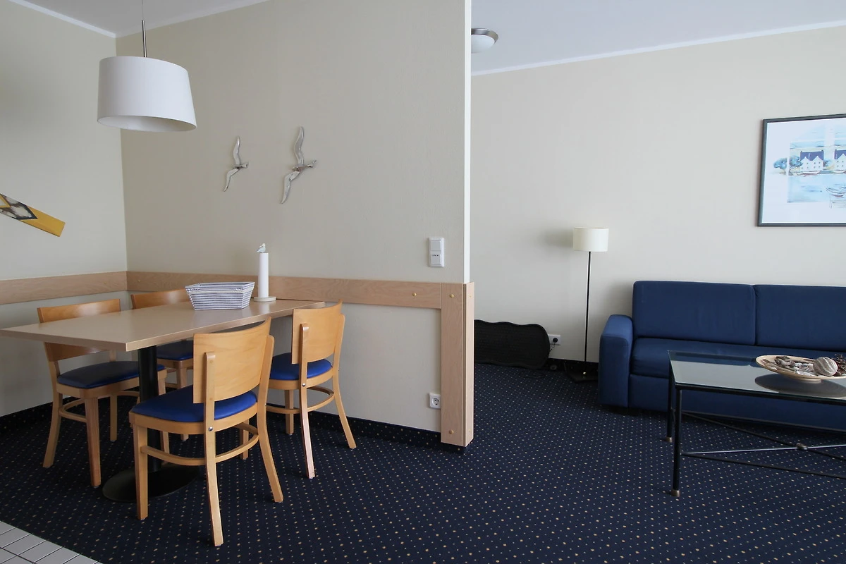 Angeboten wird eine maritim eingerichtete und umfassend ausgestattete Ferienwohnung mit 55 m² Wohnfläche und grosszügigem Balkon. Das Appartement hat ein grosses Wohnzimmer mit offener Küche und Essecke, Schlafzimmer mit einem Doppelbett und Einbauschrank, Flur und ein Bad mit Dusche. In dem gemütlich eingerichteten Wohnraum befinden sich ein LED-TV und Blu-ray Player sowie eine ausziehbare Schlafcouch für 2 weitere Personen. Bettwäsche und Handtücher können kostenpflichtig hinzugebucht werden.