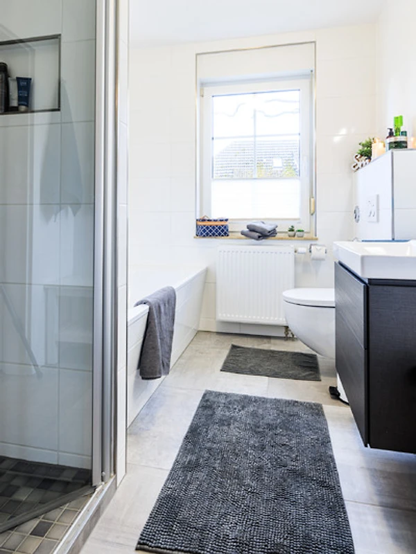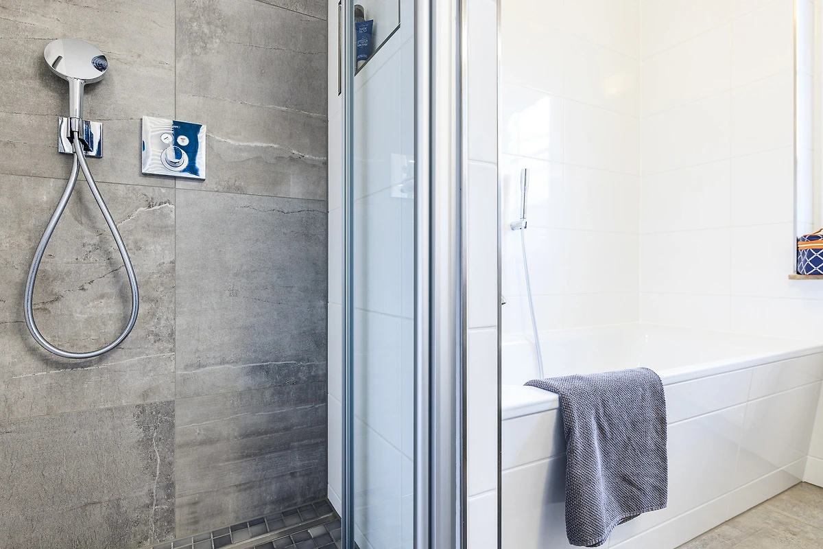 Das moderne Badezimmer bietet sowohl eine Badewanne als auch eine Dusche und WC, sodass Sie sich nach einem erlebnisreichen Tag erfrischen können. Zur weiteren Ausstattung gehören zwei Sat-Flat-TVs, ein Kinderreisebett und ein Hochstuhl, um auch den kleinen Gästen einen komfortablen Aufenthalt zu ermöglichen.