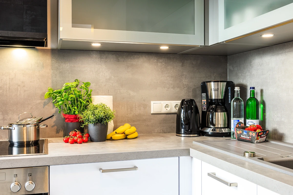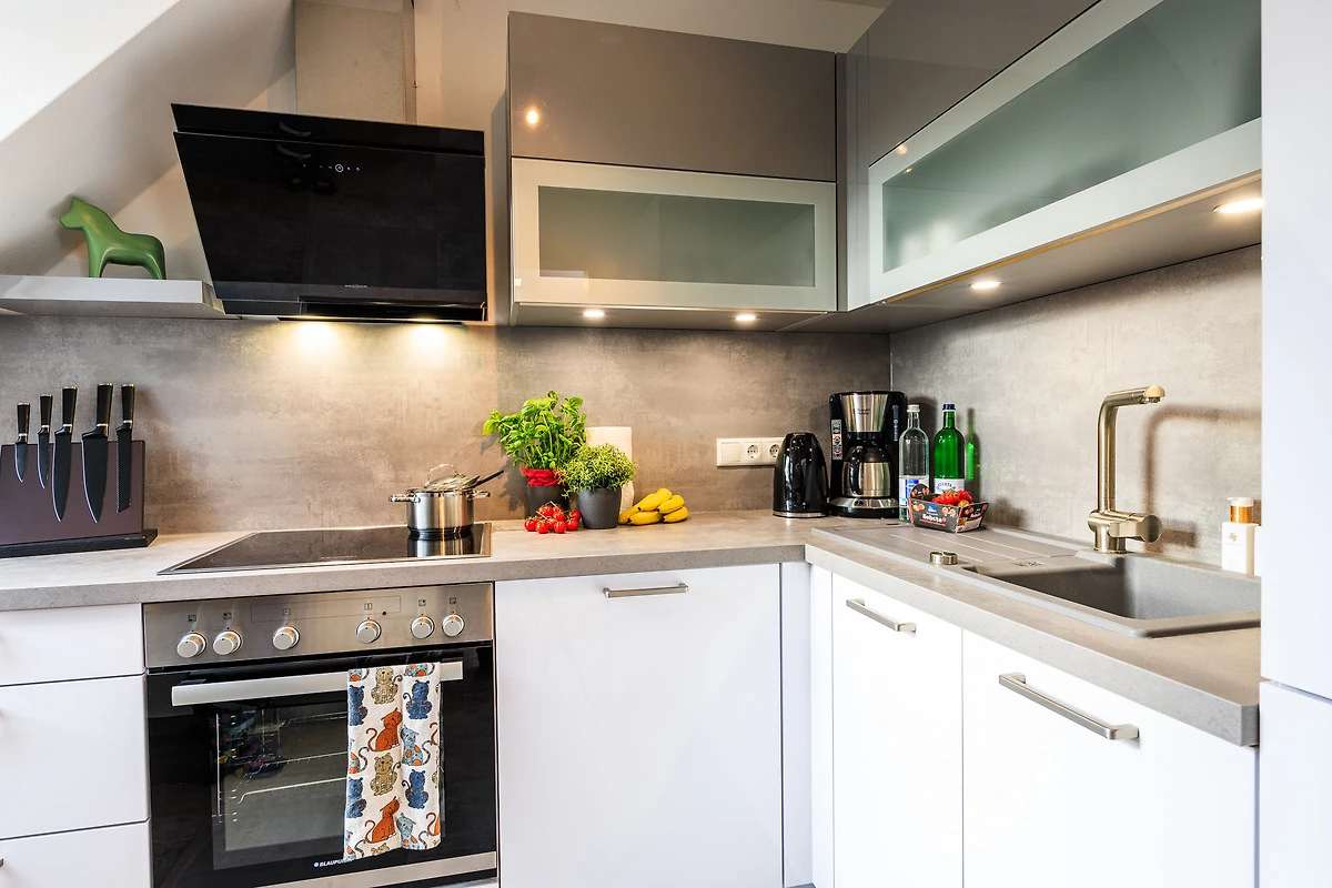 Der einladende Wohnbereich ist mit einem eleganten Ledersofa ausgestattet, das zum Entspannen einlädt. Die komplett ausgestattete Küche lässt keine Wünsche offen: Hier finden Sie einen Herd mit Cerankochfeld, einen Backofen, eine Geschirrspülmaschine, einen Kühlschrank sowie eine Kaffeemaschine und einen Toaster – perfekt für die Zubereitung von köstlichen Mahlzeiten.