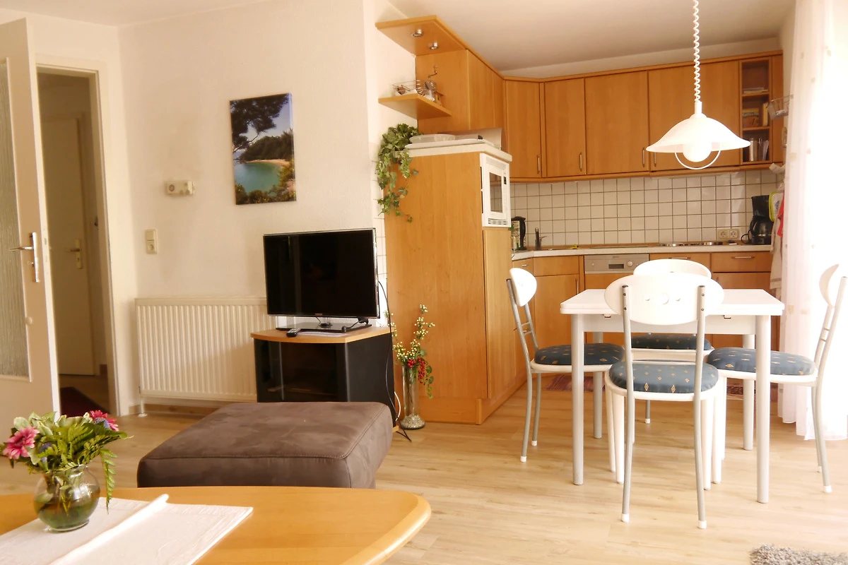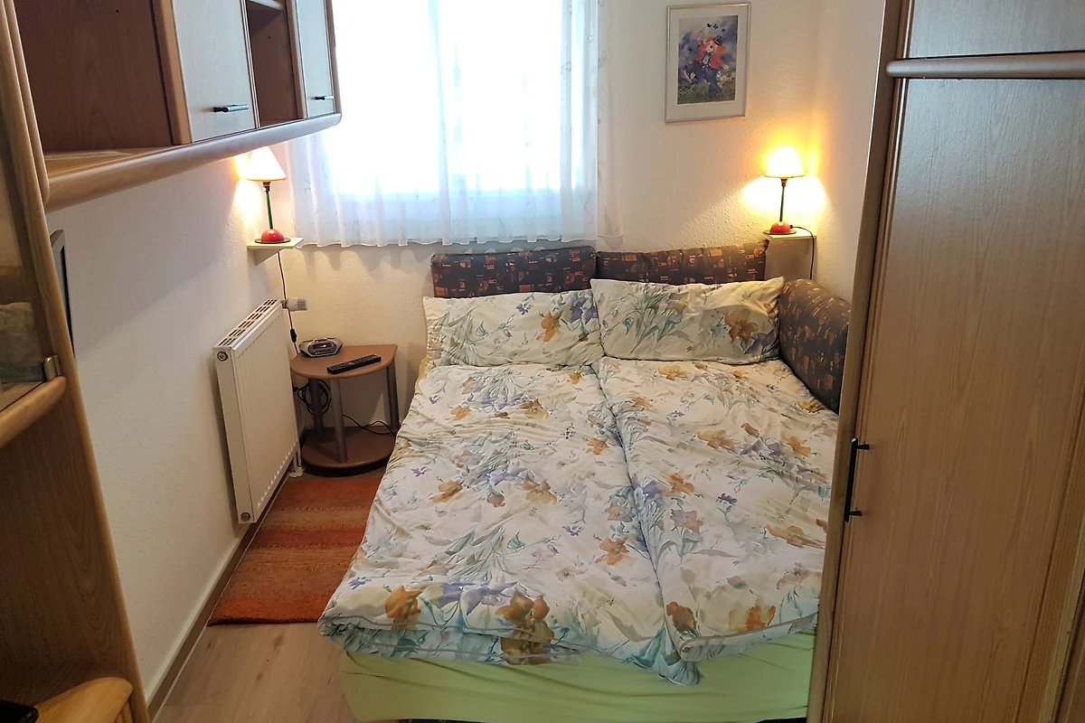Es erwartet Sie Platz für 2-4 Personen in zwei Schlafräumen (1x1 Doppelbett, 1x1 Schlafsofa), ein Wohnbereich mit einer komplett ausgestatteten Küchenzeile, ein Waschtrockner, Bügelbrett, Bügeleisen und ein modernes Badezimmer mit bodentiefer Dusche, WC und Fön. Zur weiteren Einrichtung gehören zwei HD Sat Flat-TV und zwei Stereoanlagen; Telefon und WLAN sind vorhanden. Sämtliche Fenster und die Terassentür sind mit einem Insektenschutz versehen.