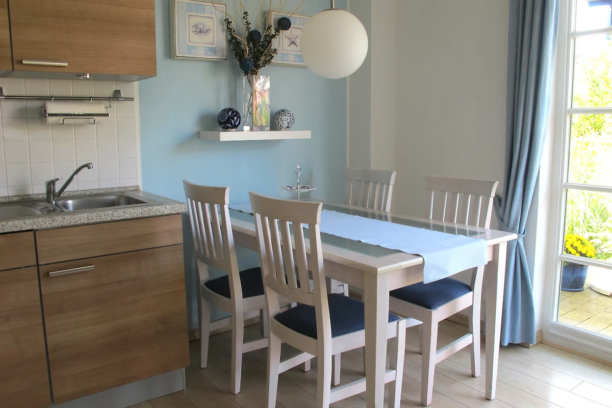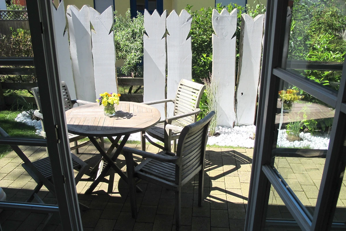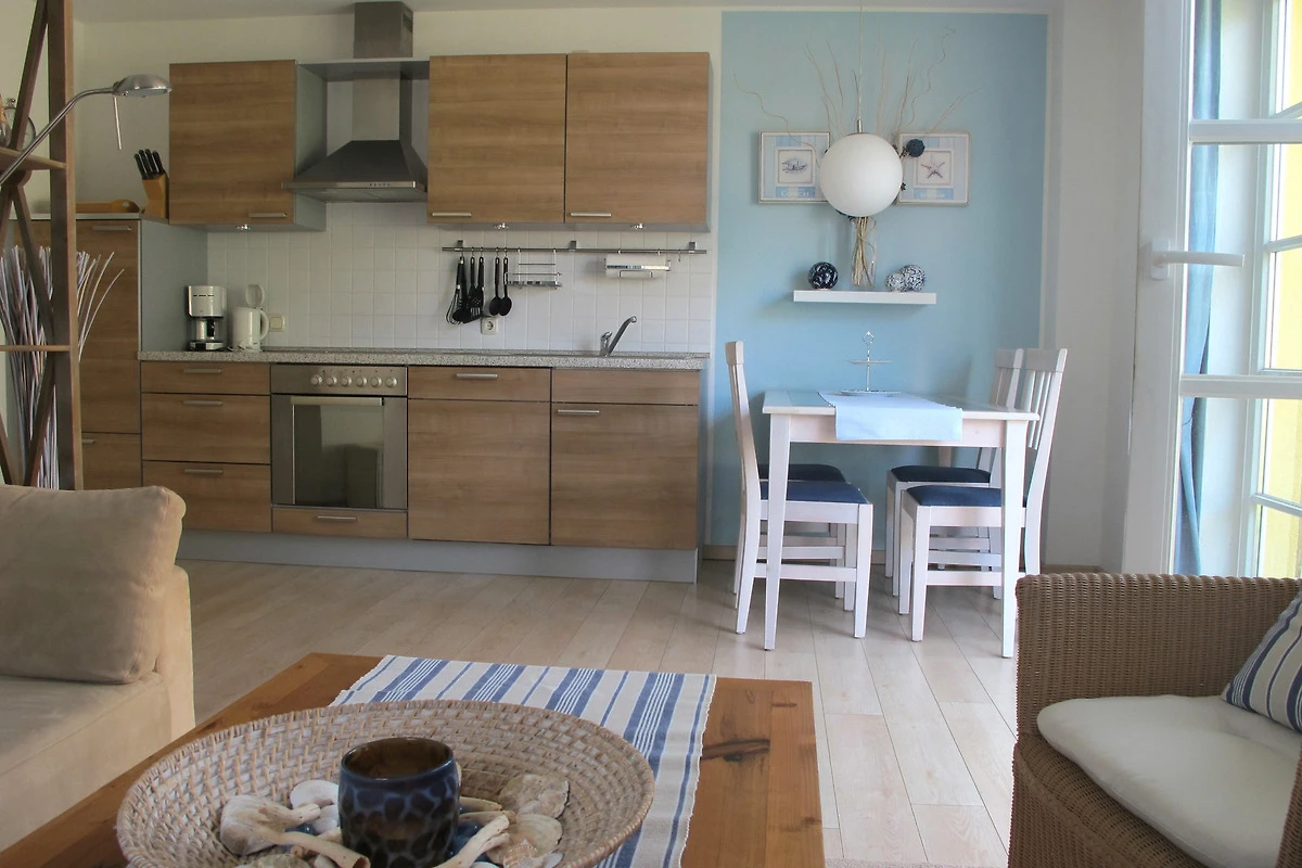Der Wohnraum ist mit einem hochwertigen Schlafsofa für zwei Personen, einem modernen, grossen Samsung-Fernseher, einer Stereoanlage mit USB-Anschluss, einem offenen Küchenbereich mit Essecke und mit direktem Zugang zur Terasse (Westseite) ausgestattet.