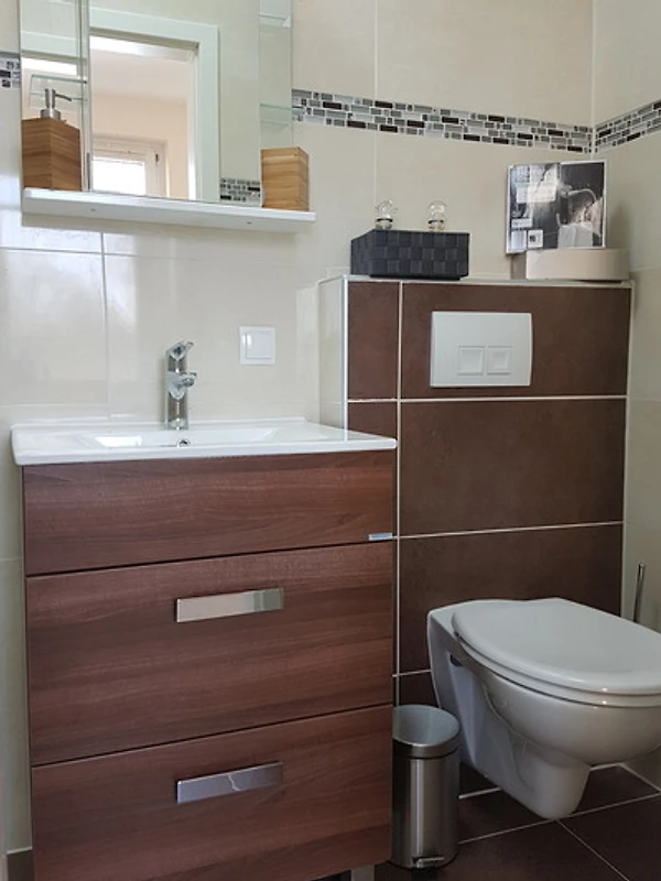 Die modernen Bäder sind mit grossen Fliesen in hellbeige Hochglanzoptik und design Bordüre gefliesst. Bodentiefe Duschböden und Regenwalddusche sowie Sicherheitsglasduschkabinen vermitteln ein exklusives Ambiente.