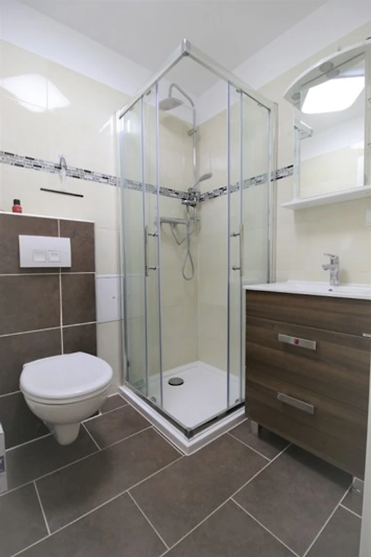 Die modernen Bäder sind mit grossen Fliesen in hell beige Hochglanzoptik und design Bordüre gefliesst. Bodentiefe Duschböden und Regenwalddusche sowie Sicherheitsglasduschkabinen vermitteln ein exclusives Ambiente.