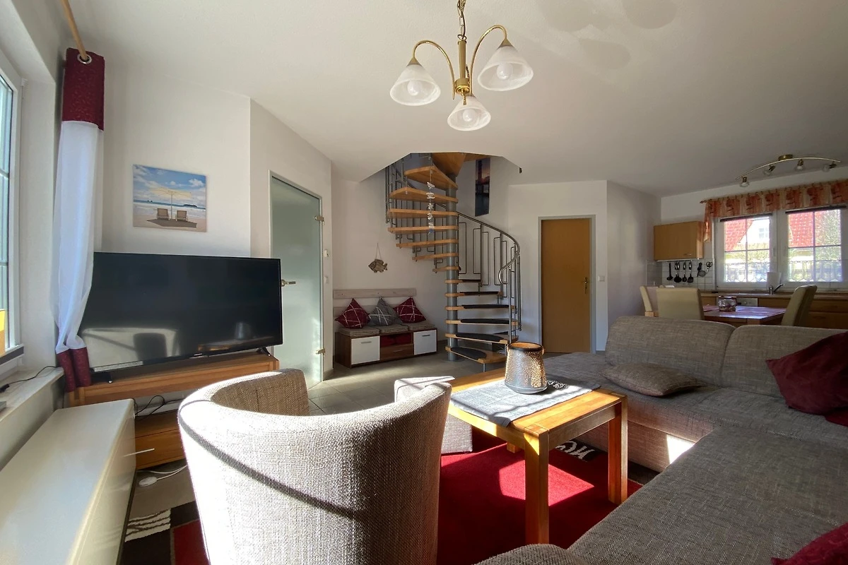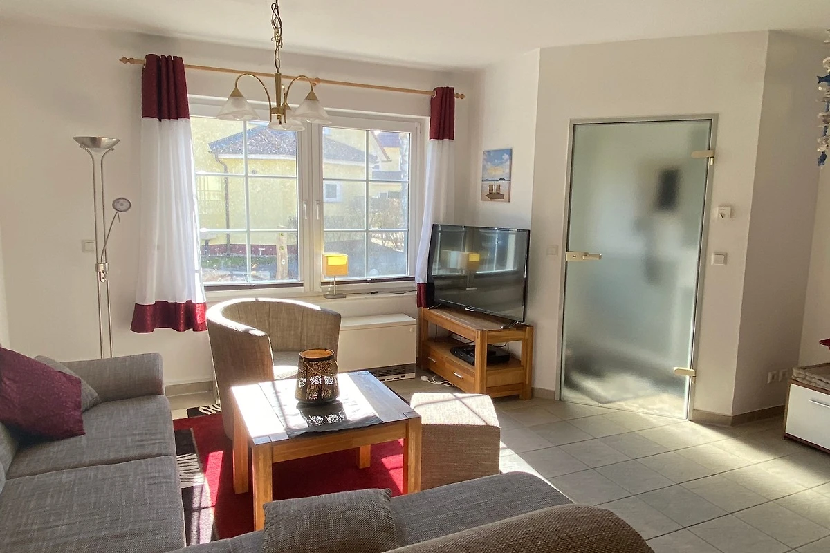In dem gemütlich eingerichtetem Wohnzimmer stehen Ihnen ein LCD-TV, eine Stereoanlage mit CD, Bücher und div. Gesellschaftsspiele für Gross und Klein zur Verfügung. Von hier haben Sie einen direkten Zugang zur sonnigen Süd-Terrasse mit bequemen Gartenmöbeln und Grill wo Sie einen schönen Strandtag ausklingen lassen können.