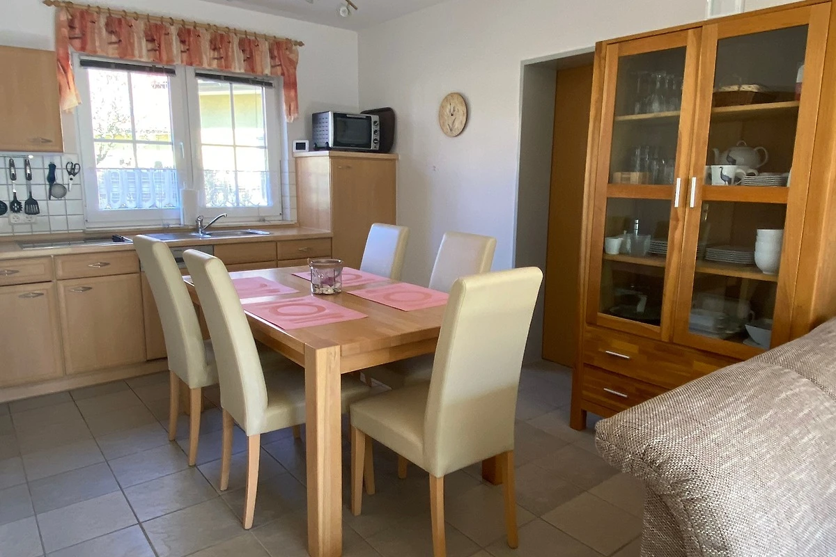 Auf gleicher Ebene befindet sich die offene Küche, ausgestattet mit Kühlschrank (incl. *** Gefrierfach),•Geschirrspülmaschine, Grillbackofen und div. Elektrogeräte (Kaffeemaschine, Wasserkocher, Toaster) und allem anderen was man so zum Kochen benötigt. Angrenzend befindet sich die Essecke für 5 Personen.