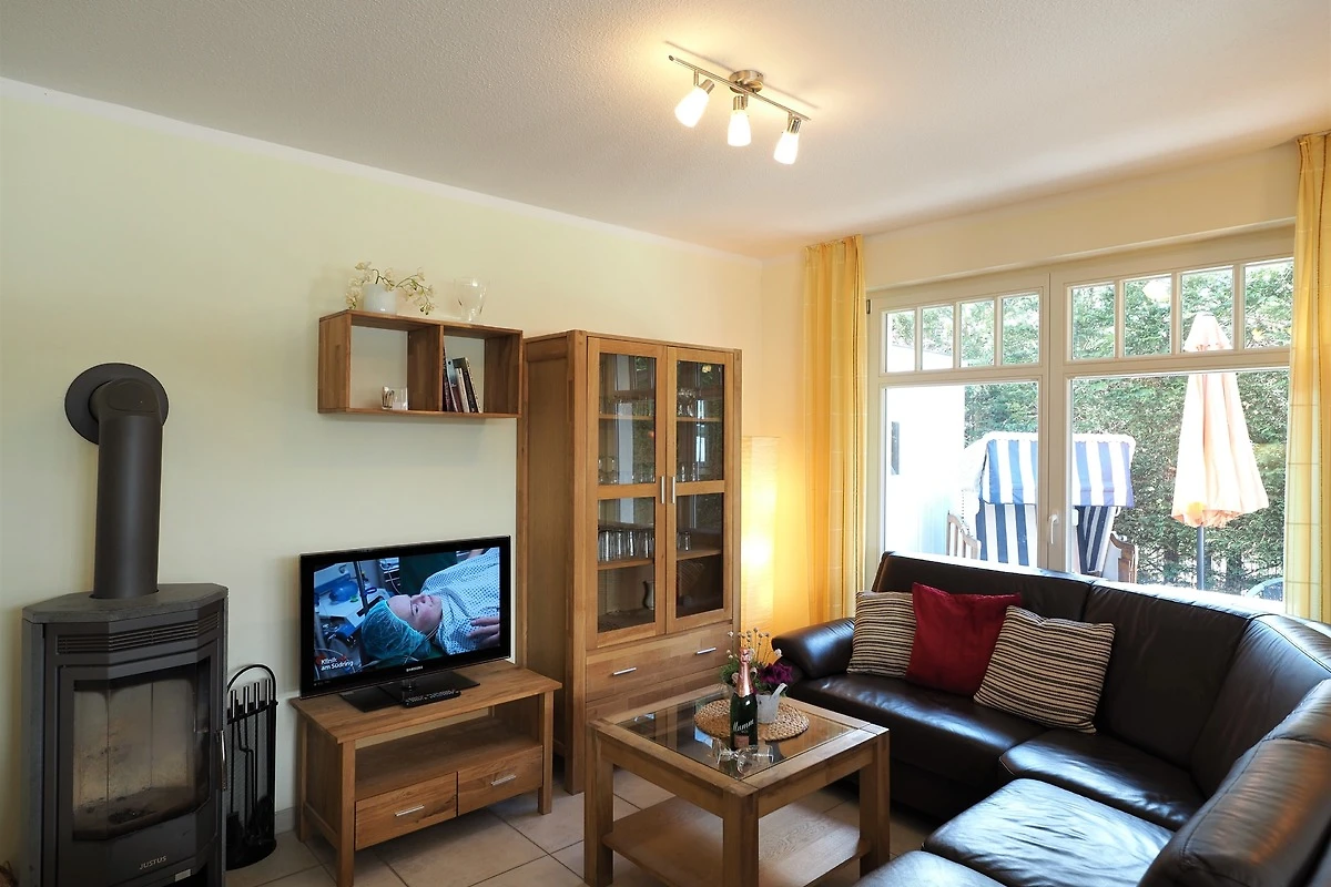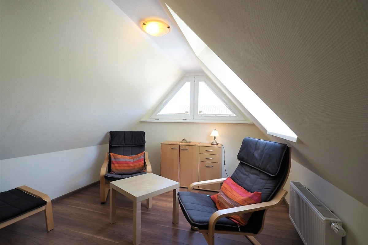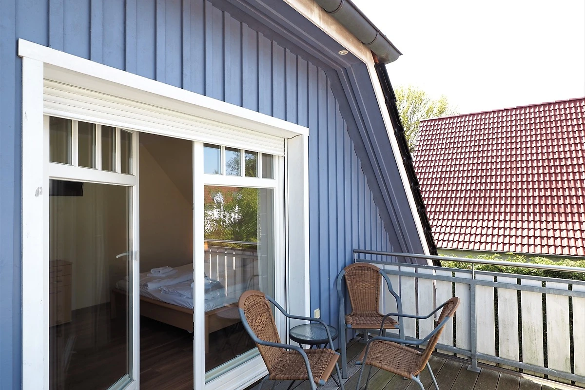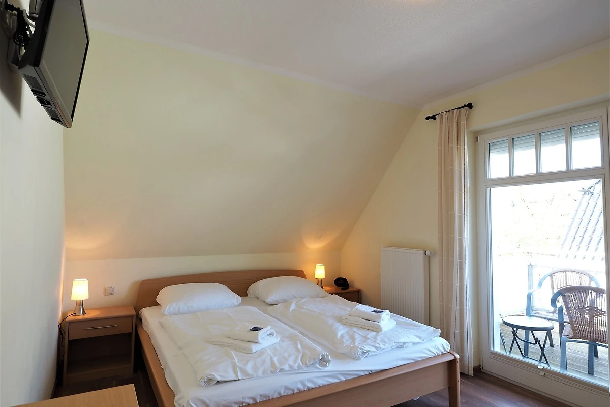 - 1 Schlafzimmer mit Doppelbett (1,80x2,00m) Federkernmatratzen mit verstellbaren Lattenrosten, 2 Sessel, TV, Zugang zum Balkon
