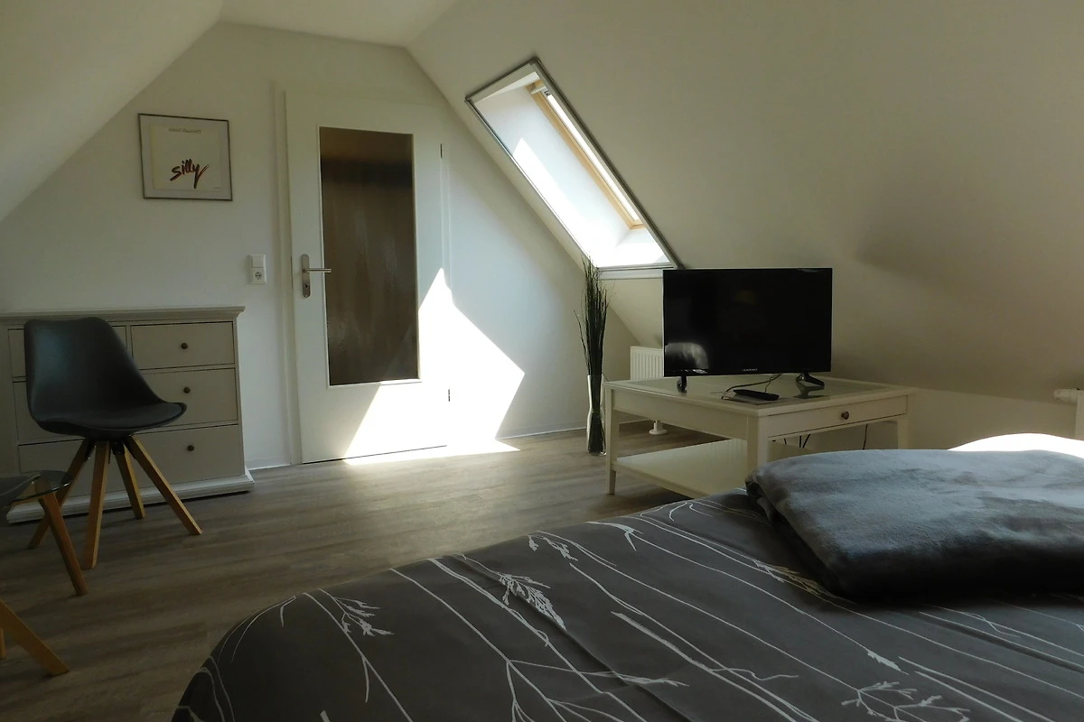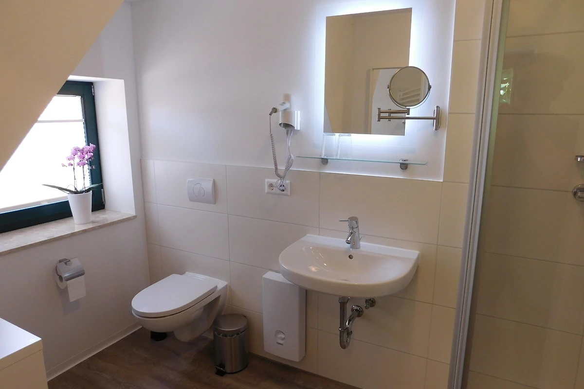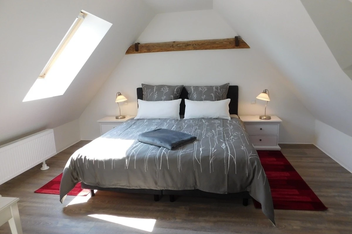 Das Bad ist mit einer ebenerdigen Dusche ausgestattet. Über eine bequeme kleine Treppe kommen Sie in das gemütliche Schlafzimmer im Dachgeschoss.