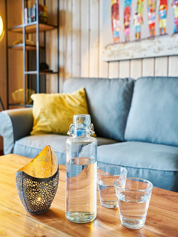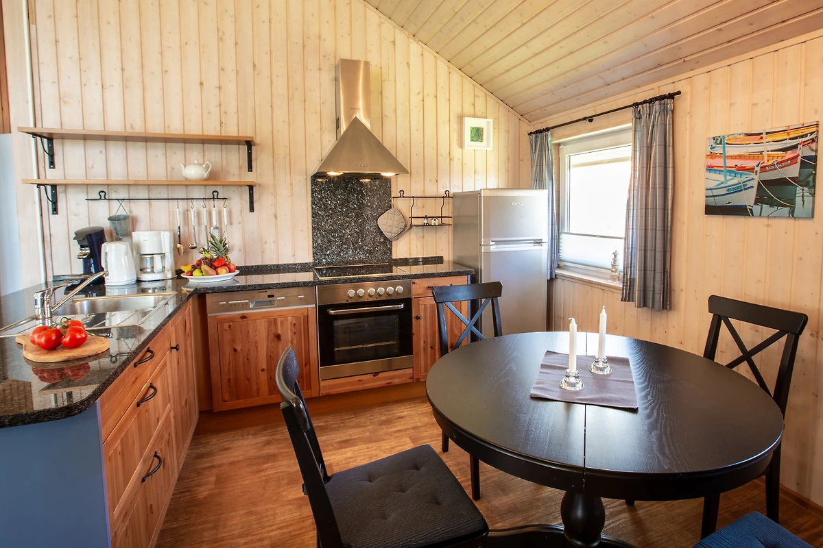 Der Haustyp A verfügt über zwei separate Schlafzimmer mit einem Doppelbett und zwei Einzelbetten. Der grosszügige Wohnraum geht in den offenen Küchen- und Essbereich über. Der Kaminofen bildet das Zentrum des Wohnraumes und lädt zu gemütlichen Abenden ein. Massive Kiefernmöbel, antik gebeizt und die Farbe blau bestimmen hier das maritime Erscheinungsbild. Vom Badezimmer mit Dusche gibt es einen direkten Zugang zur Sauna.