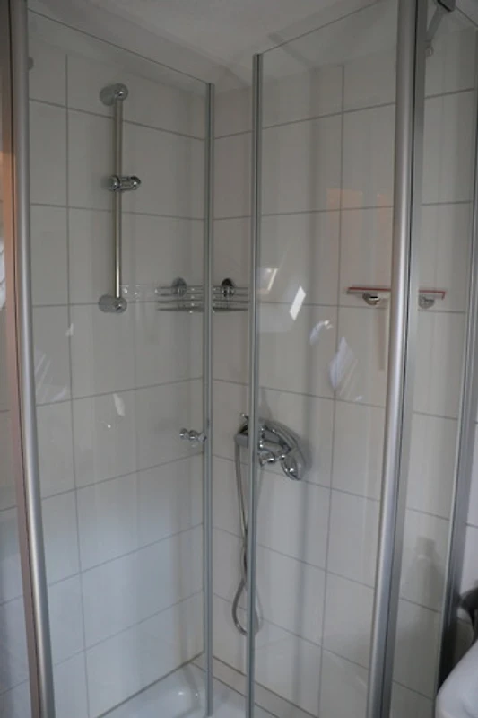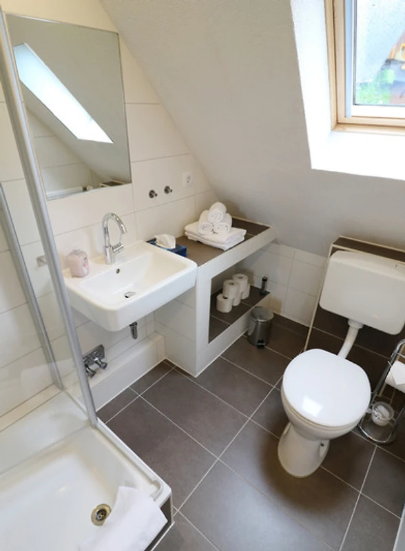 Im Badezimmer gibt es ein Waschbecken, eine Dusche und ein WC.