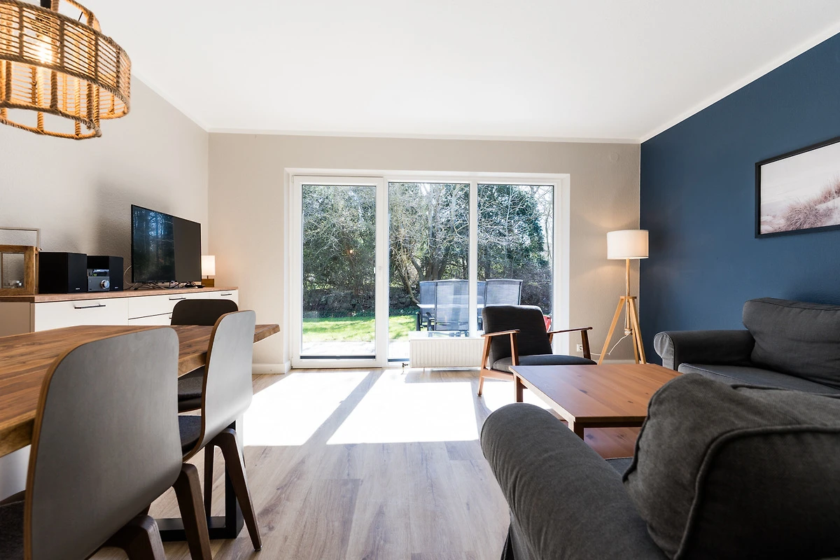 Im lichtdurchfluteten Wohn-Esszimmer erwarten Sie ein Flachbid-TV mit DVD-Player, ein Radio und ein CD-Player.