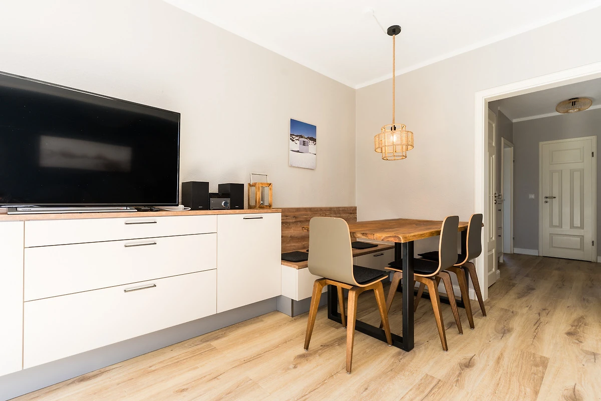 Im lichtdurchfluteten Wohn-Esszimmer erwarten Sie ein Flachbid-TV mit DVD-Player, ein Radio und ein CD-Player.