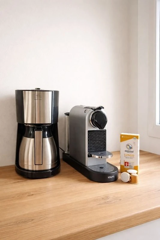 Die Wohnküche mit Essplatz ist komplett ausgestattet mit allen Geräten und Utensilien, die Sie benötigen.