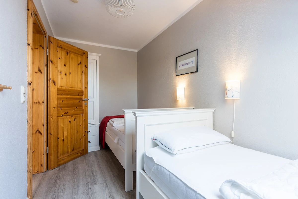 Ein Schlafzimmer mit 1 Doppelbett und ein Kinderzimmer mit 2 Einzelbetten befinden sich im Obergeschoss, ebenso ein Badezimmer mit Dusche.