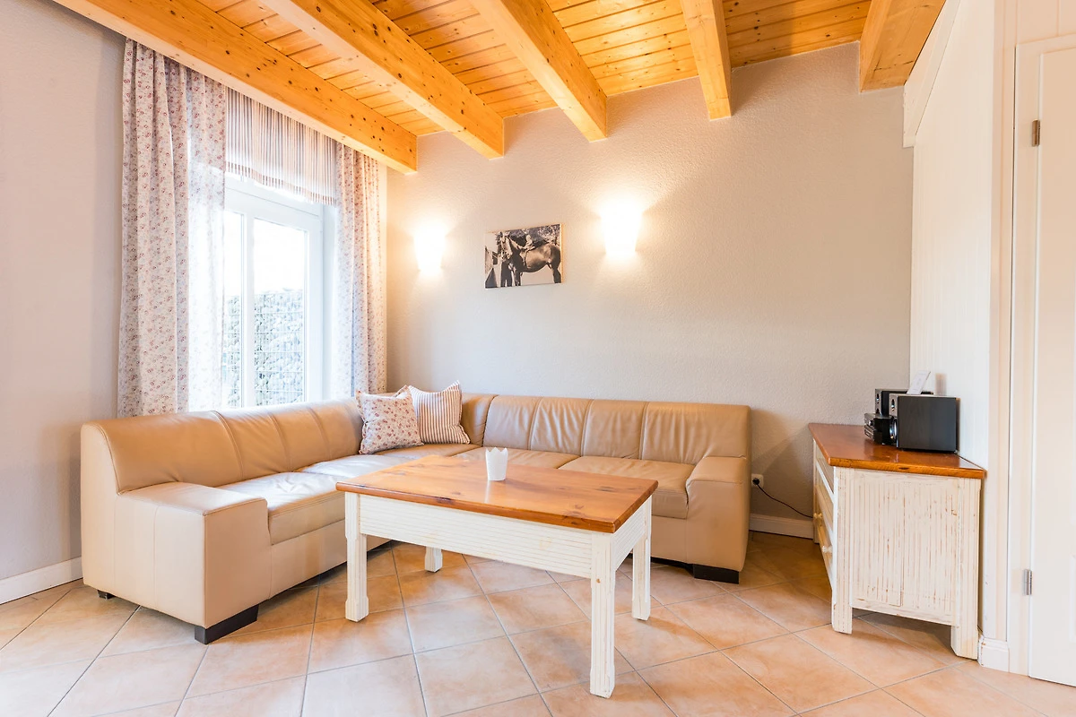 Im lichtdurchfluteten Wohn-Esszimmer erwarten Sie ein Flachbid-TV mit DVD-Player, ein Radio und ein CD-Player.