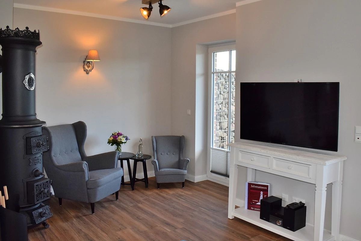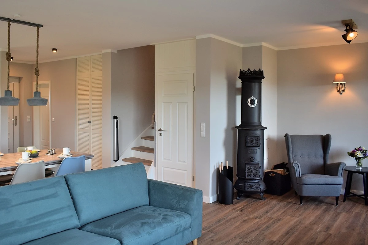 Im grosszügigen Wohn-Esszimmer mit Kaminofen erwarten Sie ein Flachbid-TV mit DVD-Player, ein Radio und ein CD-Player.