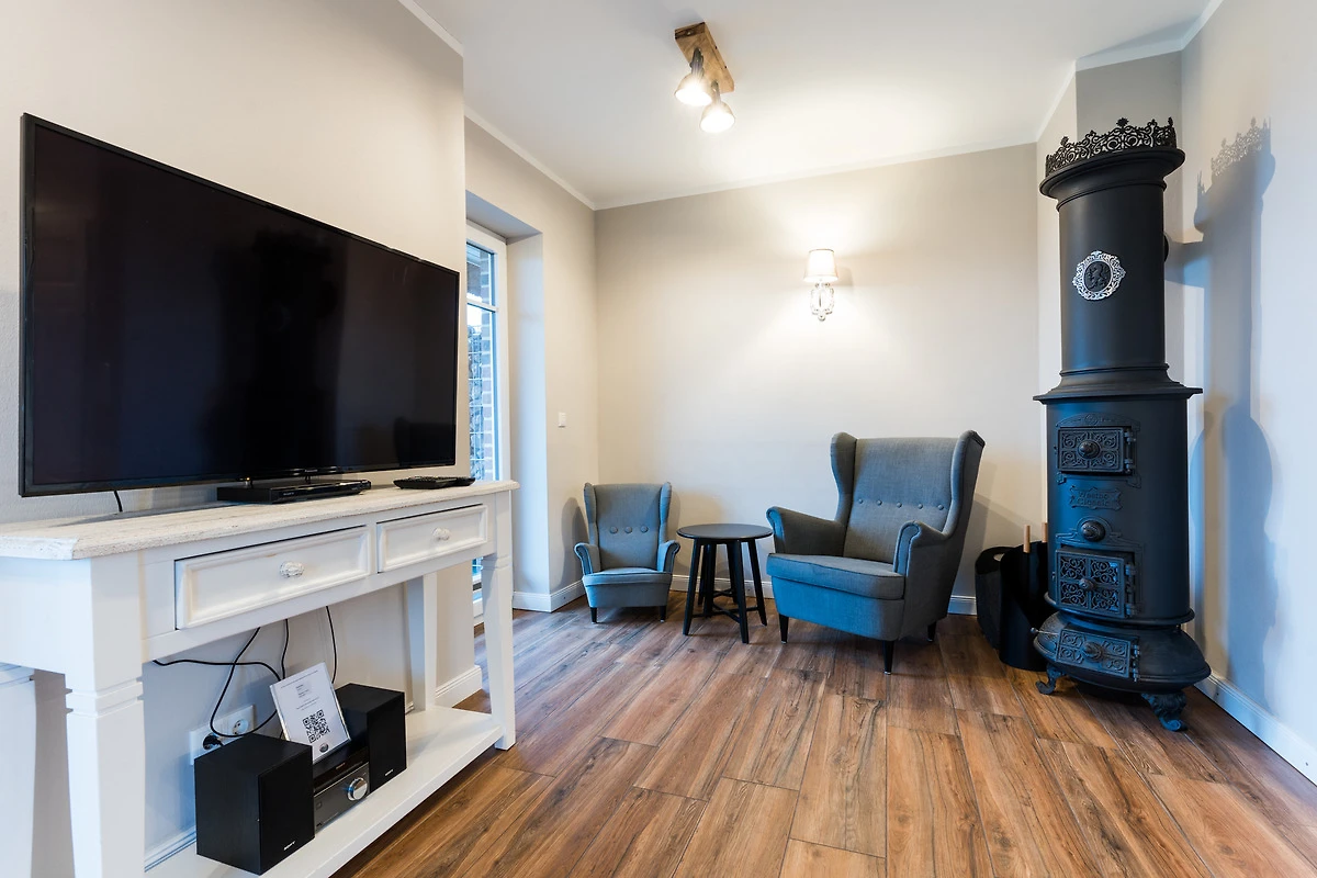 Im grosszügigen Wohn-Esszimmer mit Kaminofen erwarten Sie ein Flachbid-TV mit DVD-Player, ein Radio und ein CD-Player.