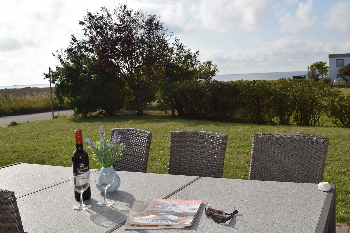 Geniessen Sie den Meerblick von der möblierten Terrasse aus oder entspannen Sie im Strandkorb direkt an der Düne.
