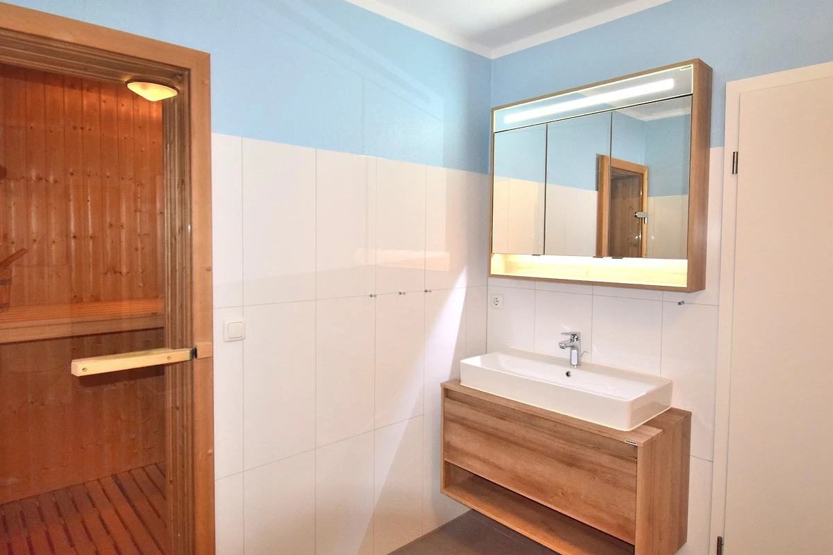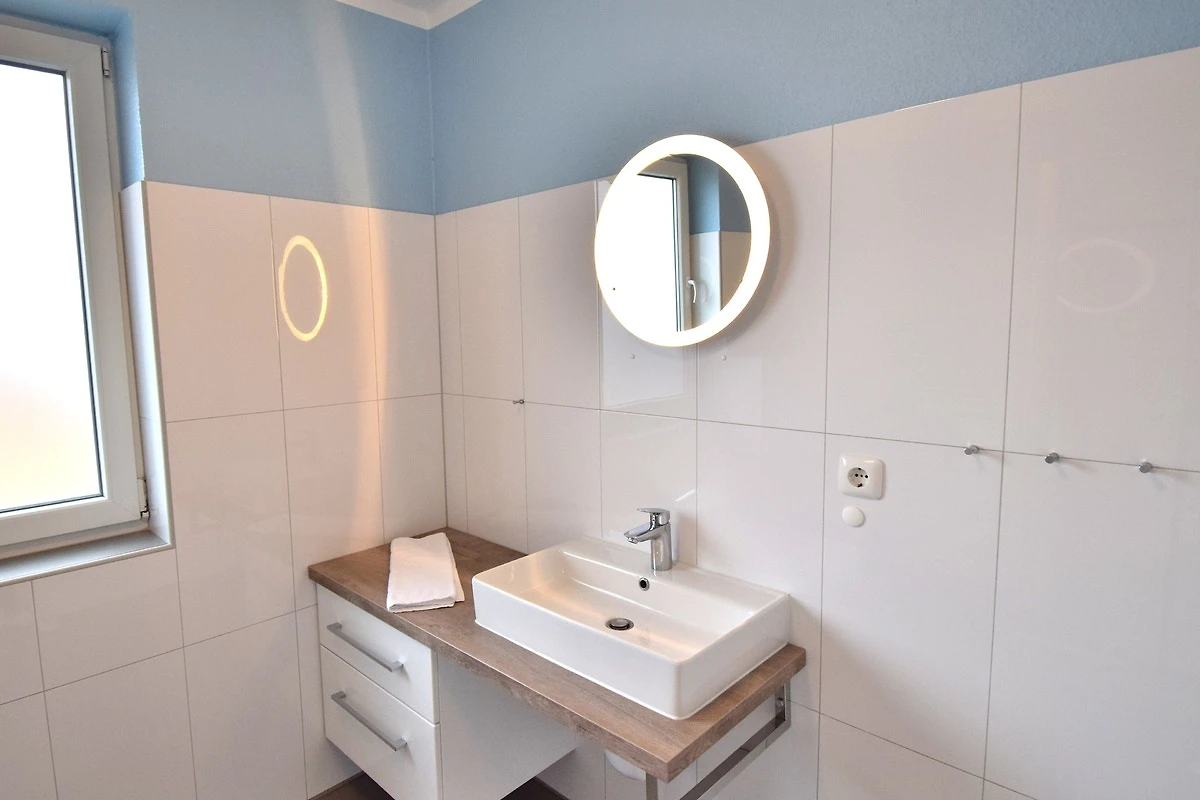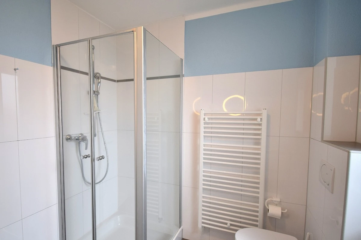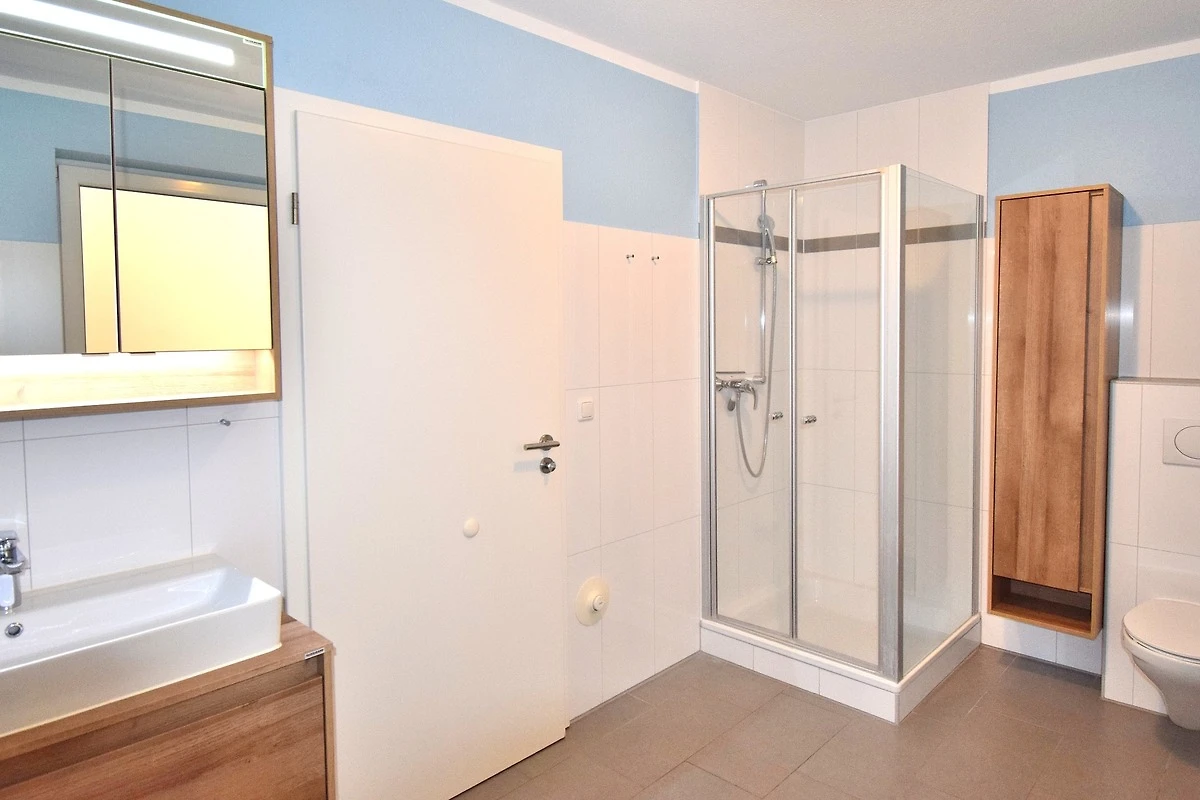 Die modernen Badezimmer mit Dusche verfügen über einen Handtuchheizkörper und Fussbodenheizung.