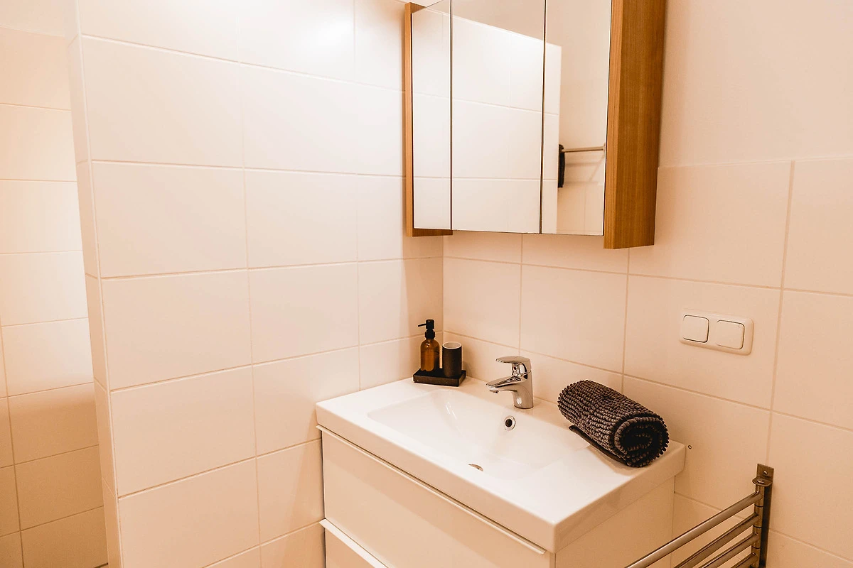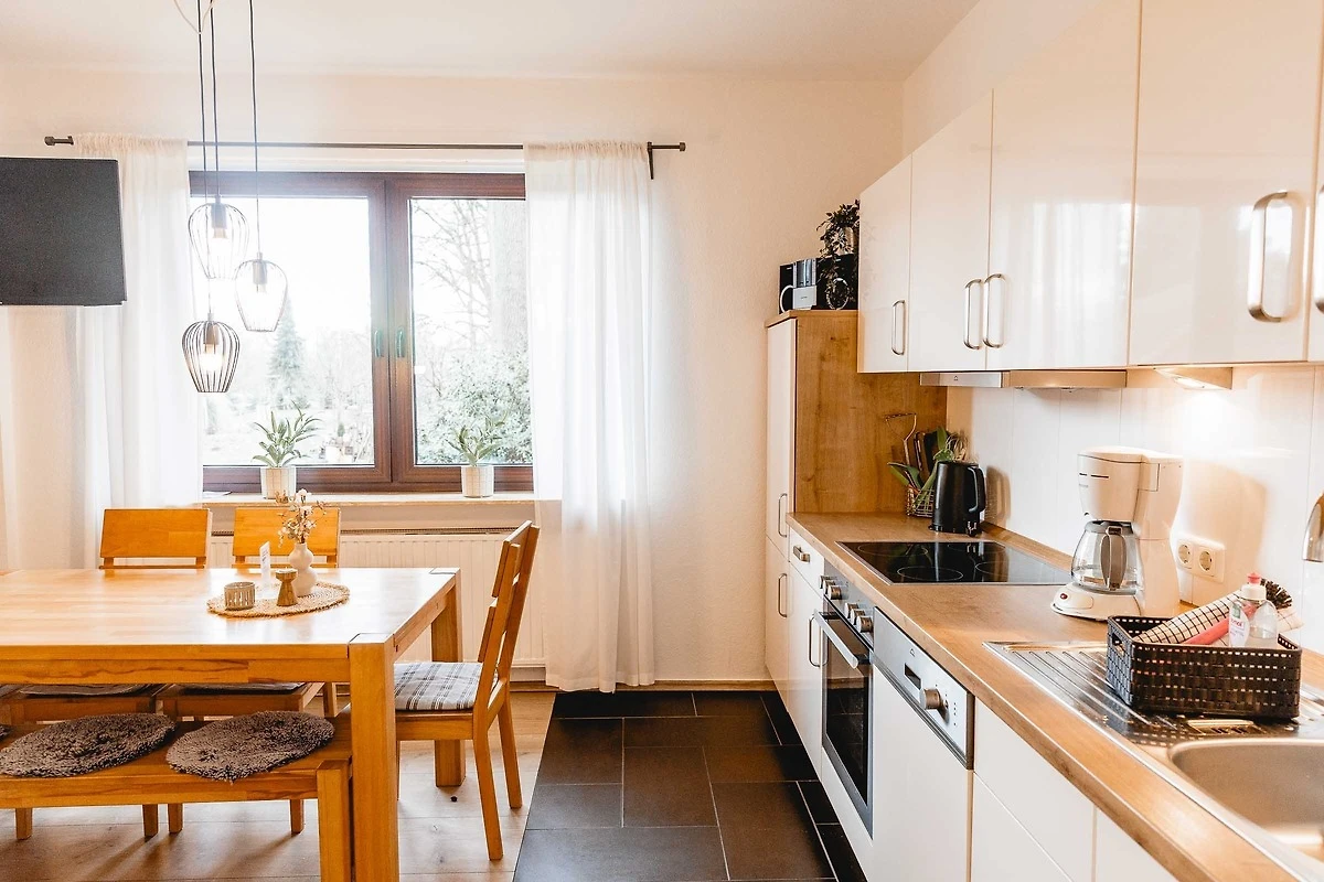 In der komplett ausgestatteten Küchenzeile gibt es u. a. einen Geschirrspüler, Backofen, Cerankochfeld, Kaffeemaschine, Wasserkocher, Toaster, Eierkocher, Küchenwaage, Handrührgerät und Pürierstab.