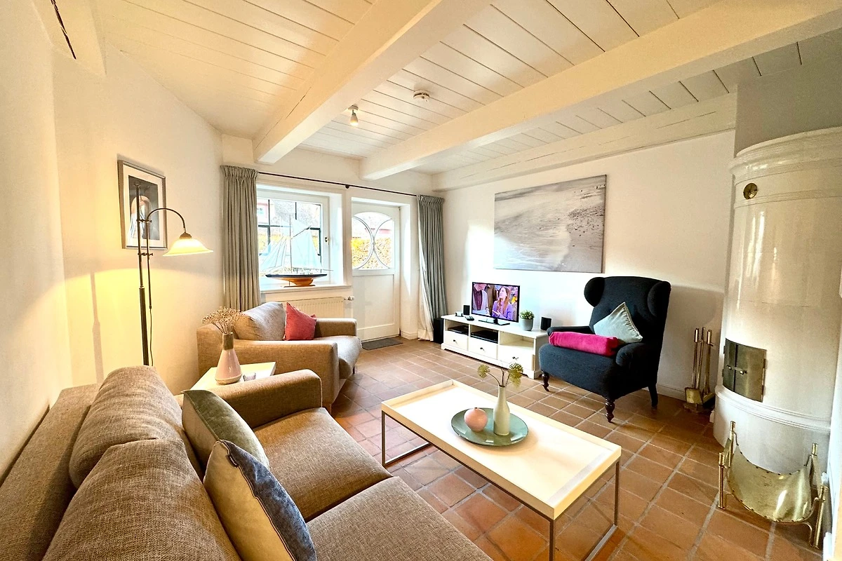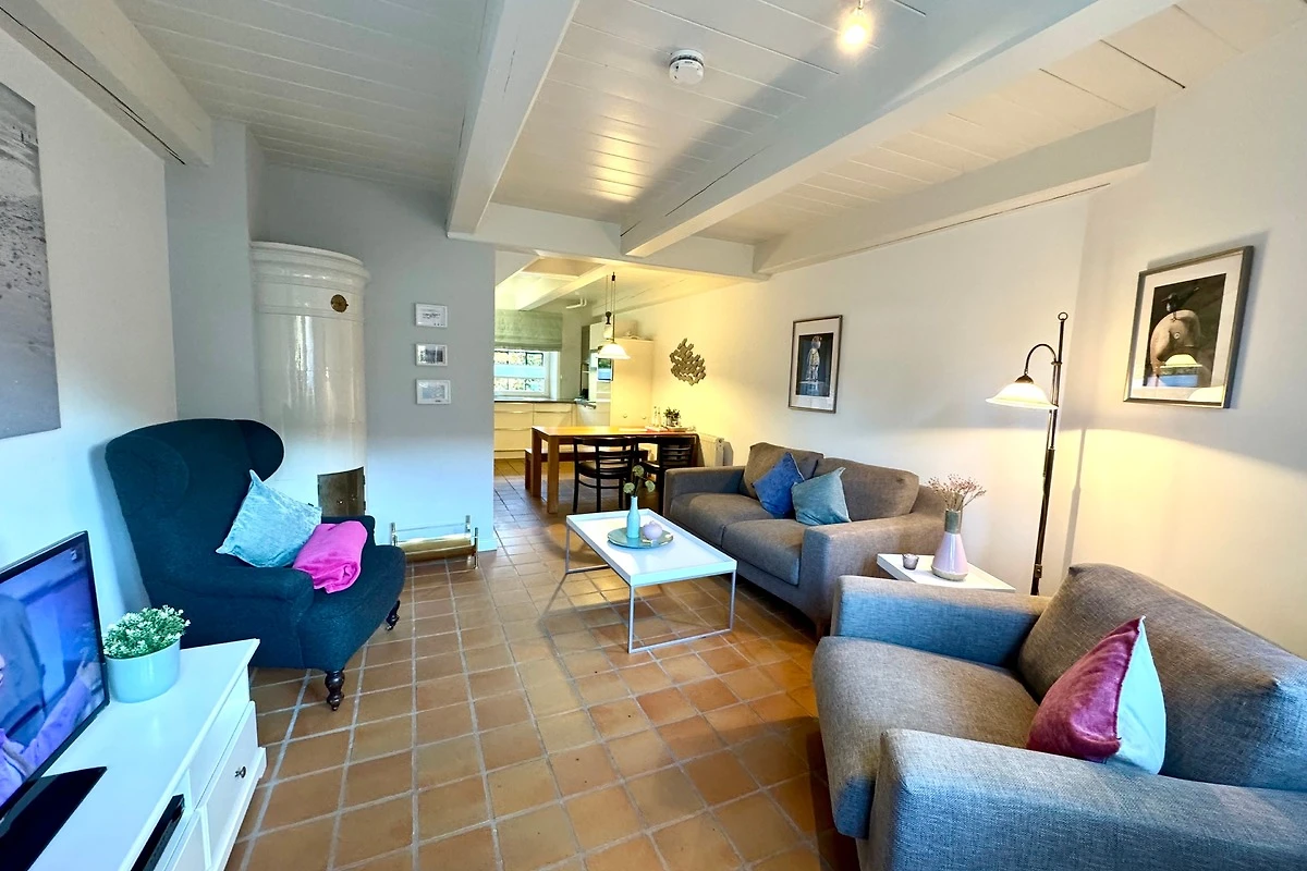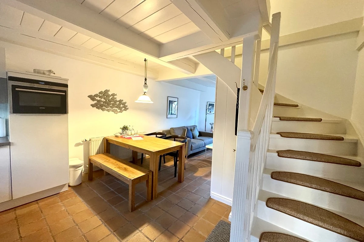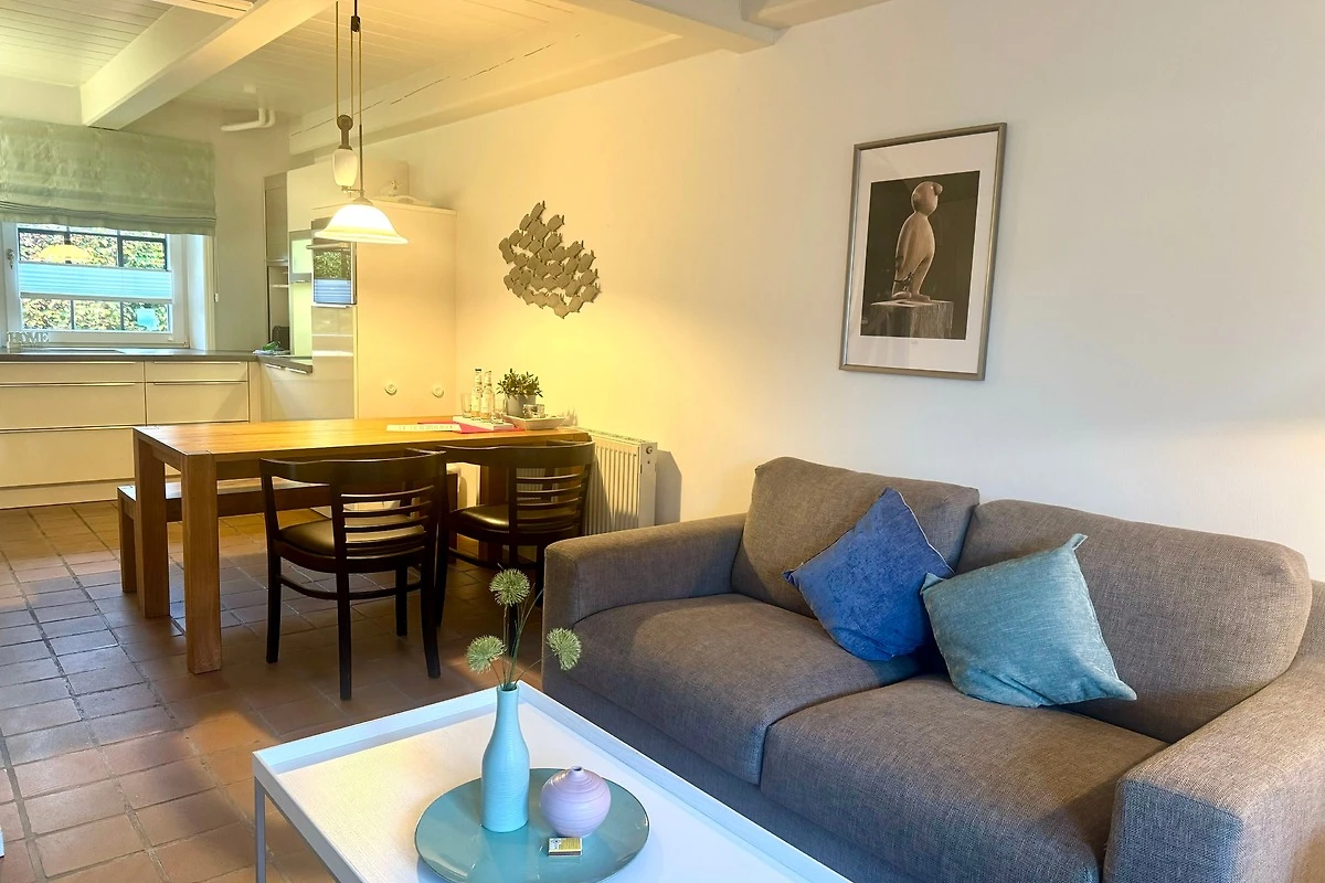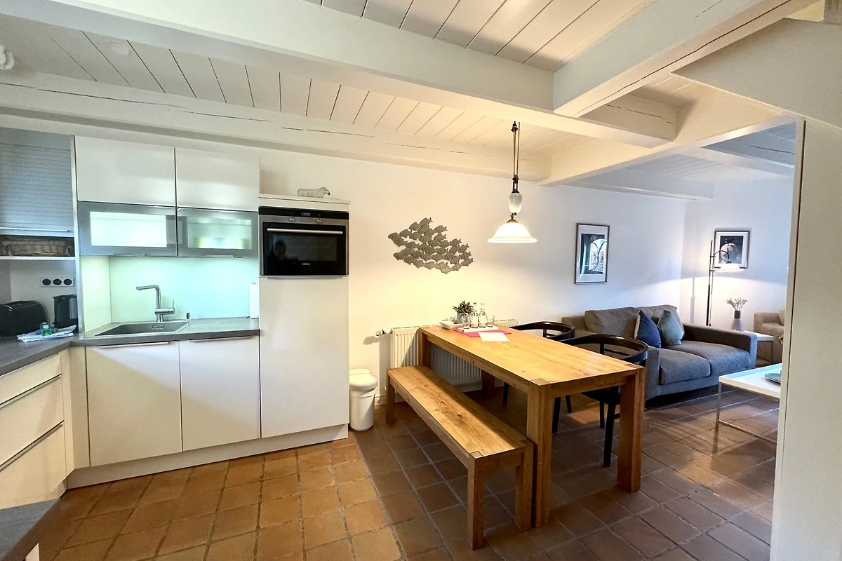Die gemütlich eingerichtete Wohnung verbindet auf ca. 65 m² modernen Komfort mit historischem Ambiente. Über die Eingangsdiele erreichen Sie die offene Wohnküche (ausgestattet mit Geschirrspüler, Backofen/Mikrowelle) mit angrenzendem Wohnbereich. Von hier haben Sie direkten Zugang zur sichtgeschützten Westterrasse. Gegenüber der Eingangstür finden Sie eine weitere Terrasse mit Strandkorb.