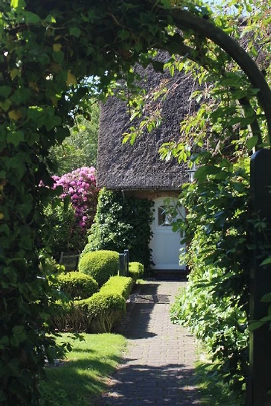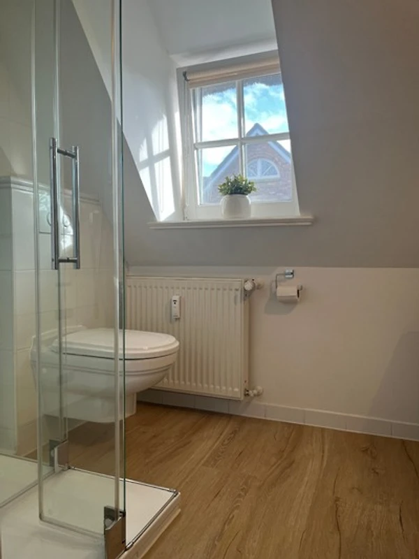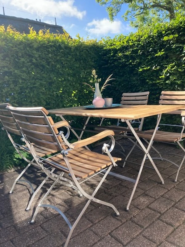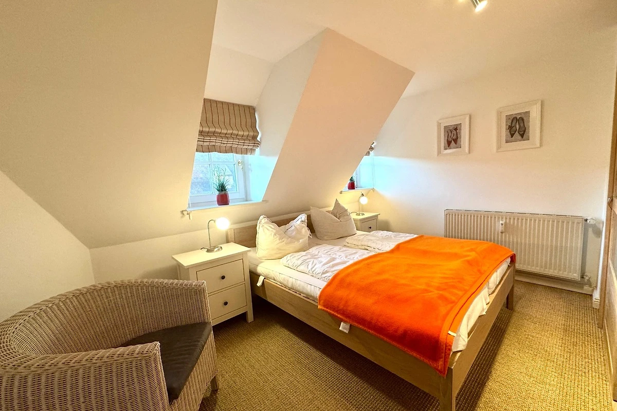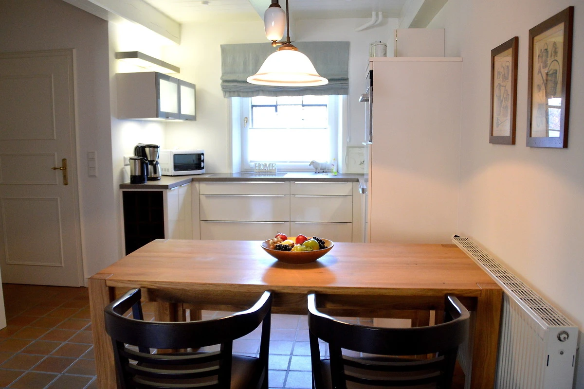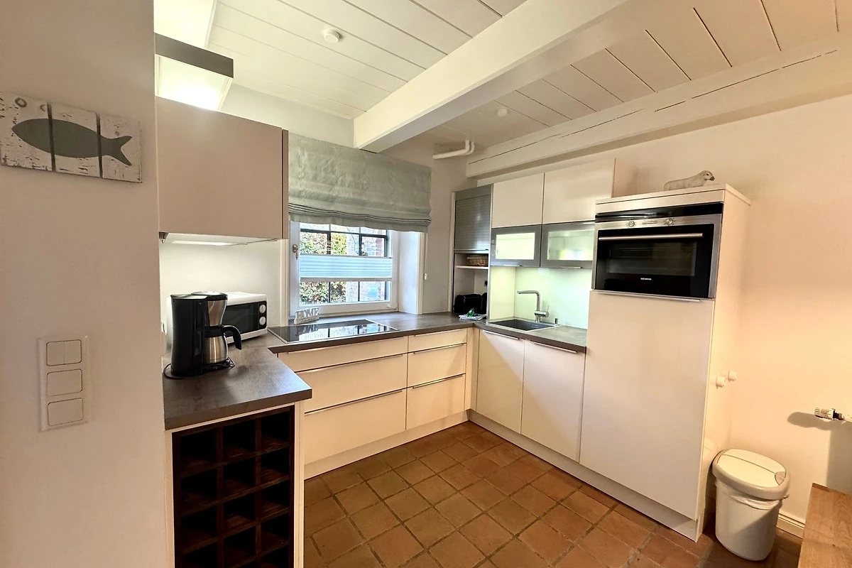 Die gemütlich eingerichtete Wohnung verbindet auf ca. 65 m² modernen Komfort mit historischem Ambiente. Über die Eingangsdiele erreichen Sie die offene Wohnküche (ausgestattet mit Geschirrspüler, Backofen/Mikrowelle) mit angrenzendem Wohnbereich. Von hier haben Sie direkten Zugang zur sichtgeschützten Westterrasse. Gegenüber der Eingangstür finden Sie eine weitere Terrasse mit Strandkorb.
