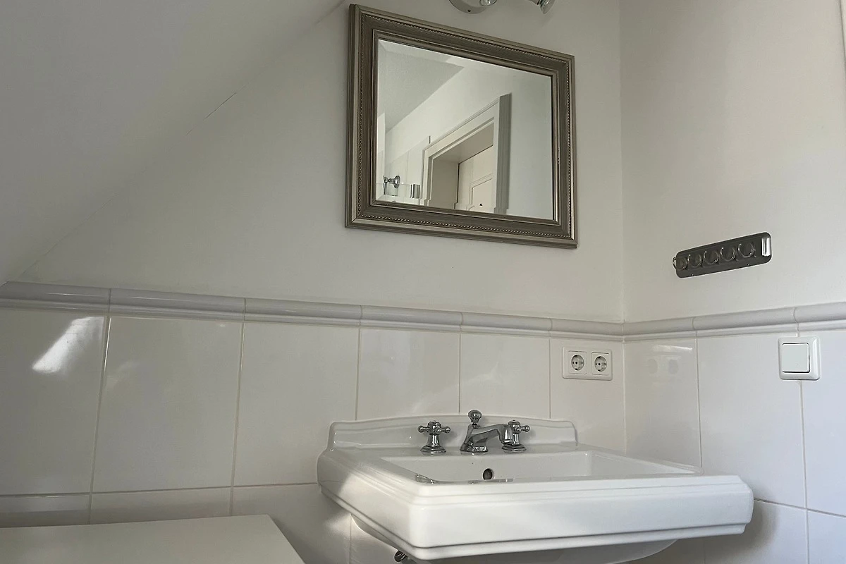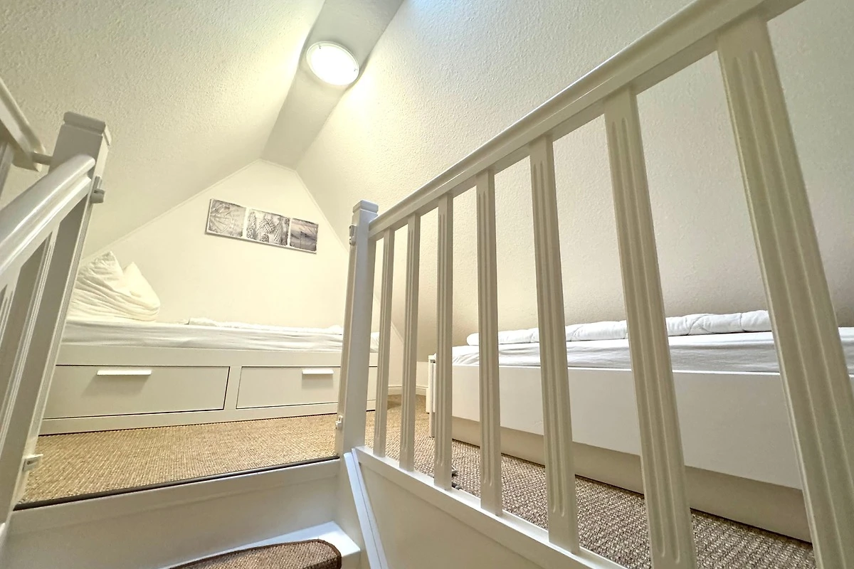 Im ersten Obergeschoss befinden sich das Badezimmer mit Duschbad, ein Flur sowie das Schlafzimmer mit Doppelbett und grossem Schrank. Über eine Treppe gelangen Sie in ein weiteres Schlafzimmer mit zwei Einzelbetten. Dieser Spitzbodenbereich ist als offene gemütliche Galerie gestaltet.
