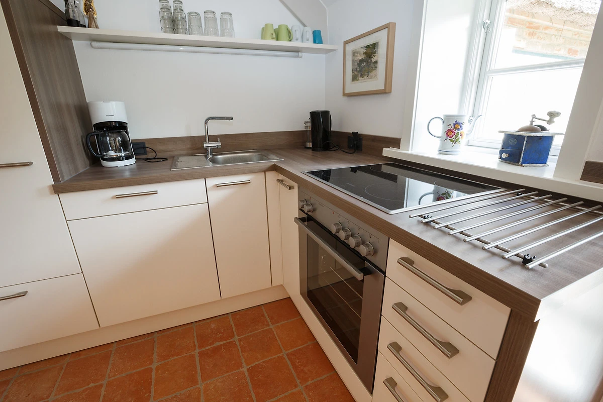 Ausstattung der Ferienwohnung: Geschirrspülmaschine, Backofen, Herd mit vier Herdplatten, Kaffeemaschine, Wasserkocher, Wäscheständer, Waschmaschine und Trockner im Gemeinschafts-Wirtschaftsraum, Parkplatz am Haus. Für unsere kleinsten Gäste stellen wir gern einen Kinderhochstuhl und ein Babyreisebett zur Verfügung.