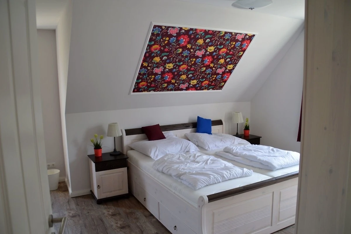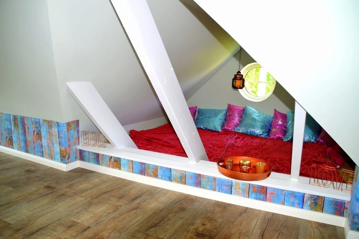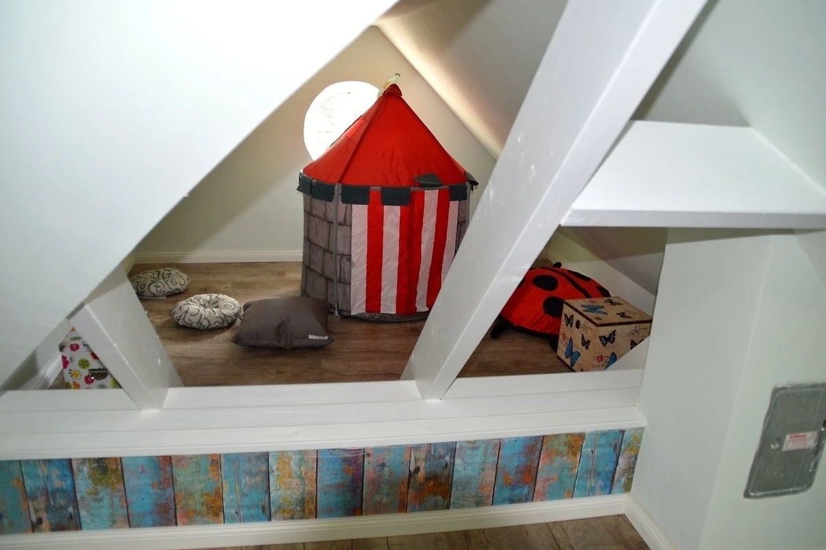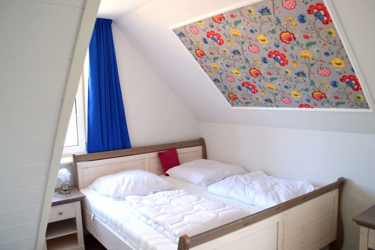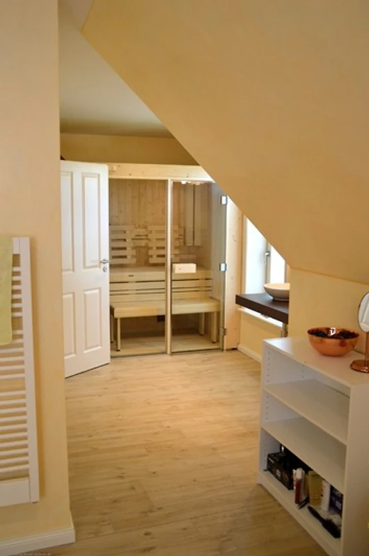 Die drei Schlafzimmer - 2 x mit Doppelbett, 1x mit zwei Einzelbetten stehen Ihnen im Obergeschoss zur Verfügung, ebenso das Wannenbad / WC und die hauseigene Sauna. Im Dachgeschoss befindet sich ein weiterer Aufenthaltsraum mit Sitzkissen, sollte das Wetter mal nicht so passend sein.