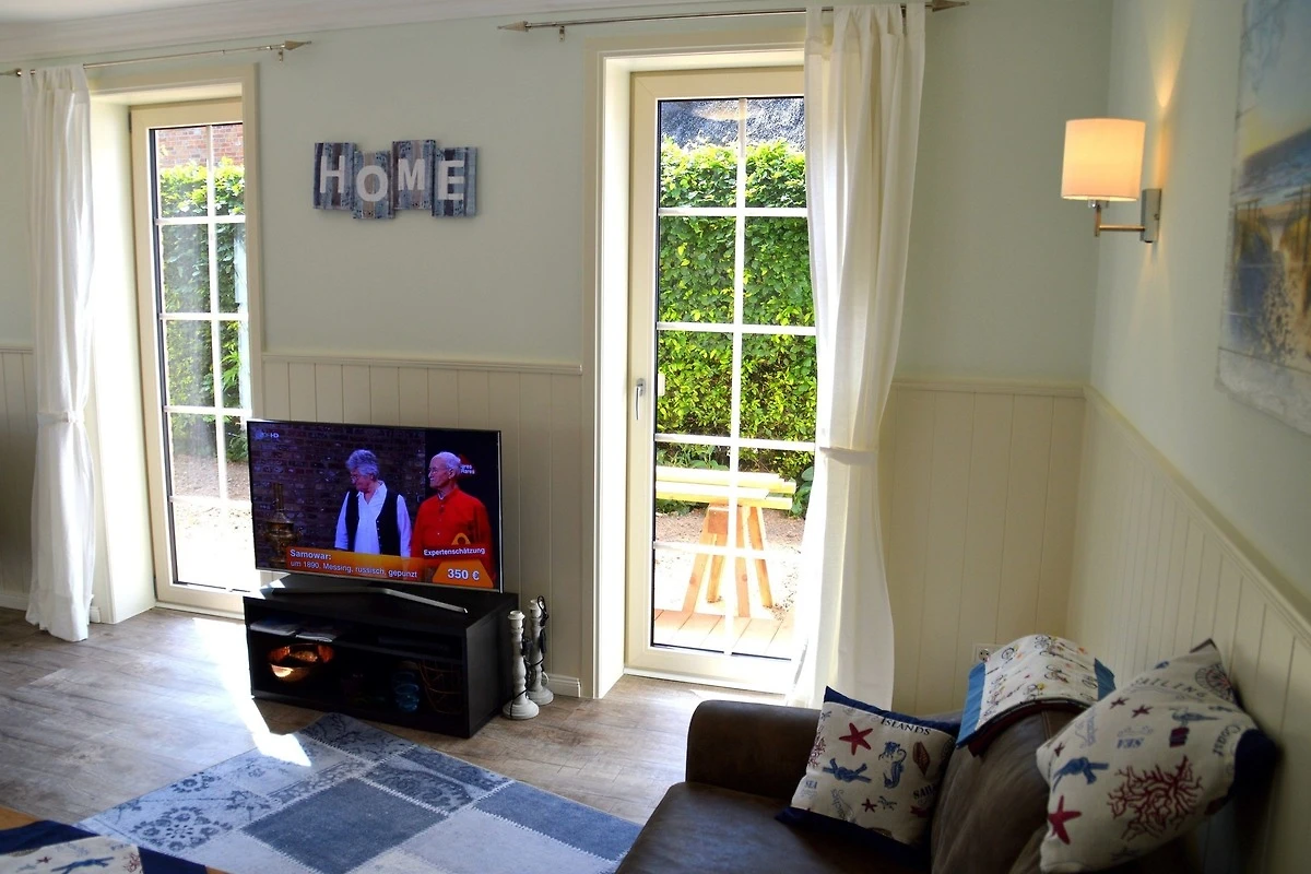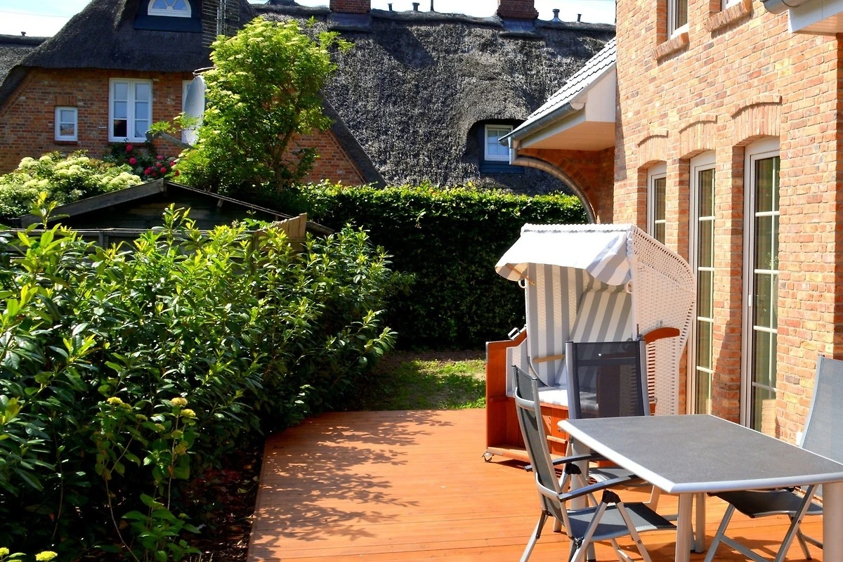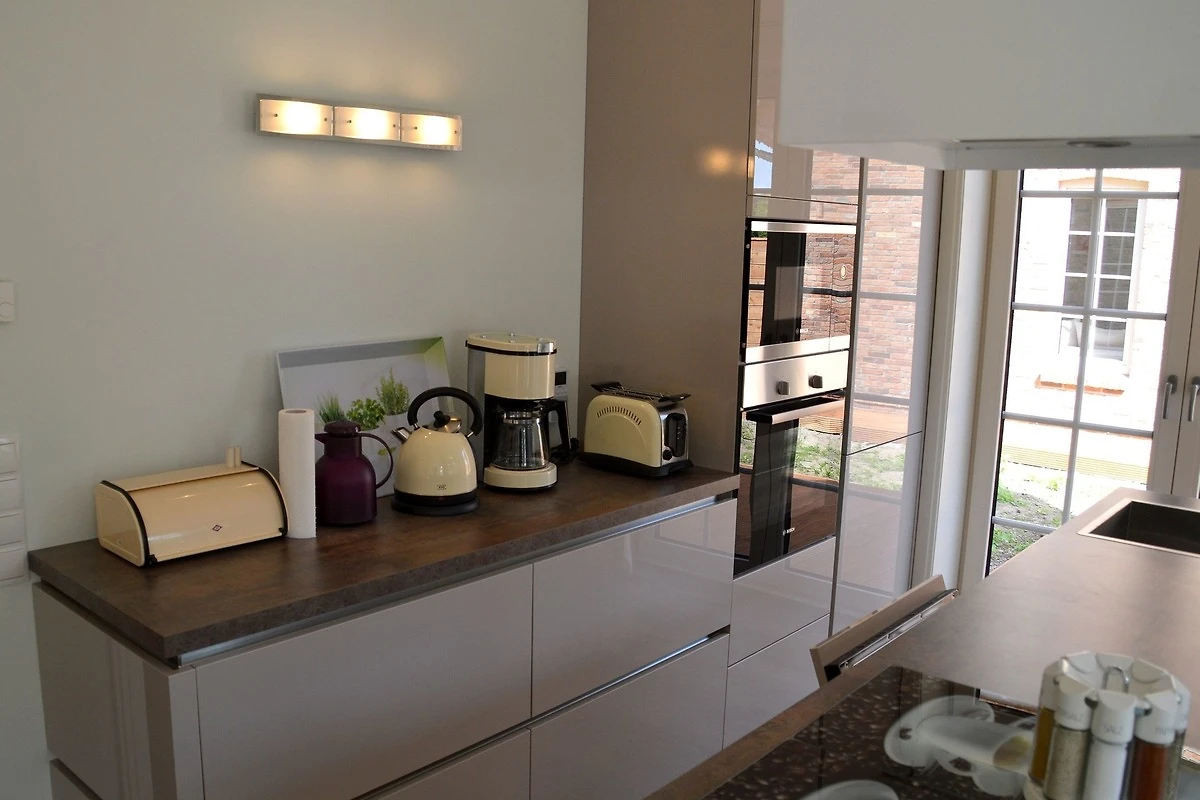Vom Wohnbereich haben Sie auch einen direkten Zugang auf die Süd- und Westterrasse mit Gartenmöbeln, Strandkorb. In der vollausgestatteten Küche finden Sie unter anderem: Geschirrspüler, Mikrowelle, Umluftherd mit Cerankochfeld, Kühlschrank mit Gefrierfach, Toaster, Handrührer, Wasserkocher, Kaffeemaschine und allerei Pütt und Pann zum Kochen und Backen. Das Geschirr und Besteck ist in ausreichender Zahl vorhanden.