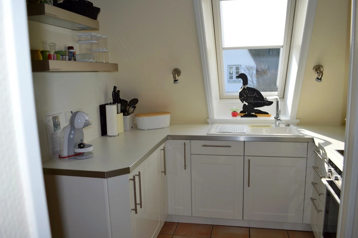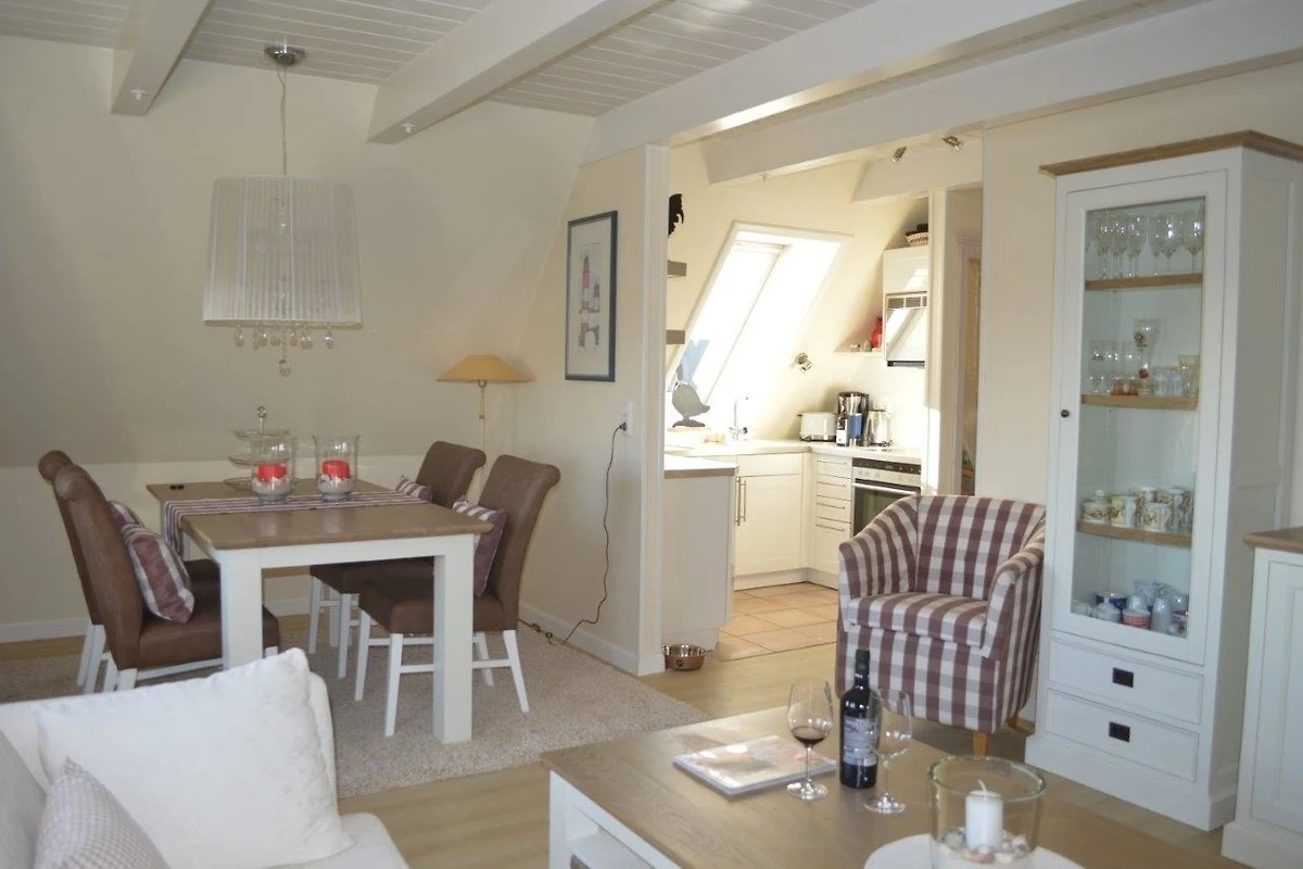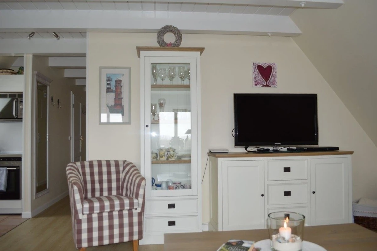 Die Wohnung ist geschmackvoll und liebevoll eingerichtet und verfügt über ein separates Schlafzimmer, einen einladenden Wohnbereich, ein modernes Badezimmer sowie eine gut ausgestattete Küchenzeile mit hochwertigen Markengeräten. Traditionelle Elemente treffen hier auf moderne Ausstattung – ideal für einen entspannten Nordseeurlaub.