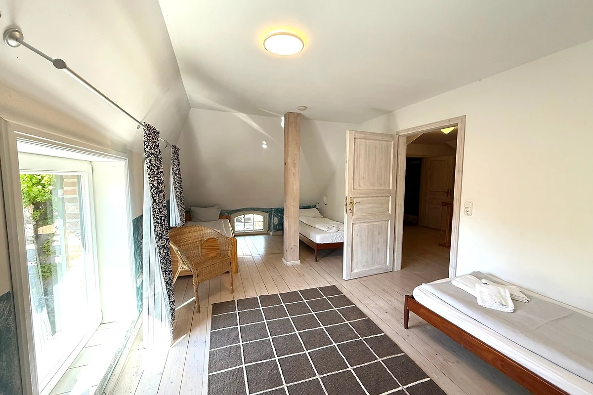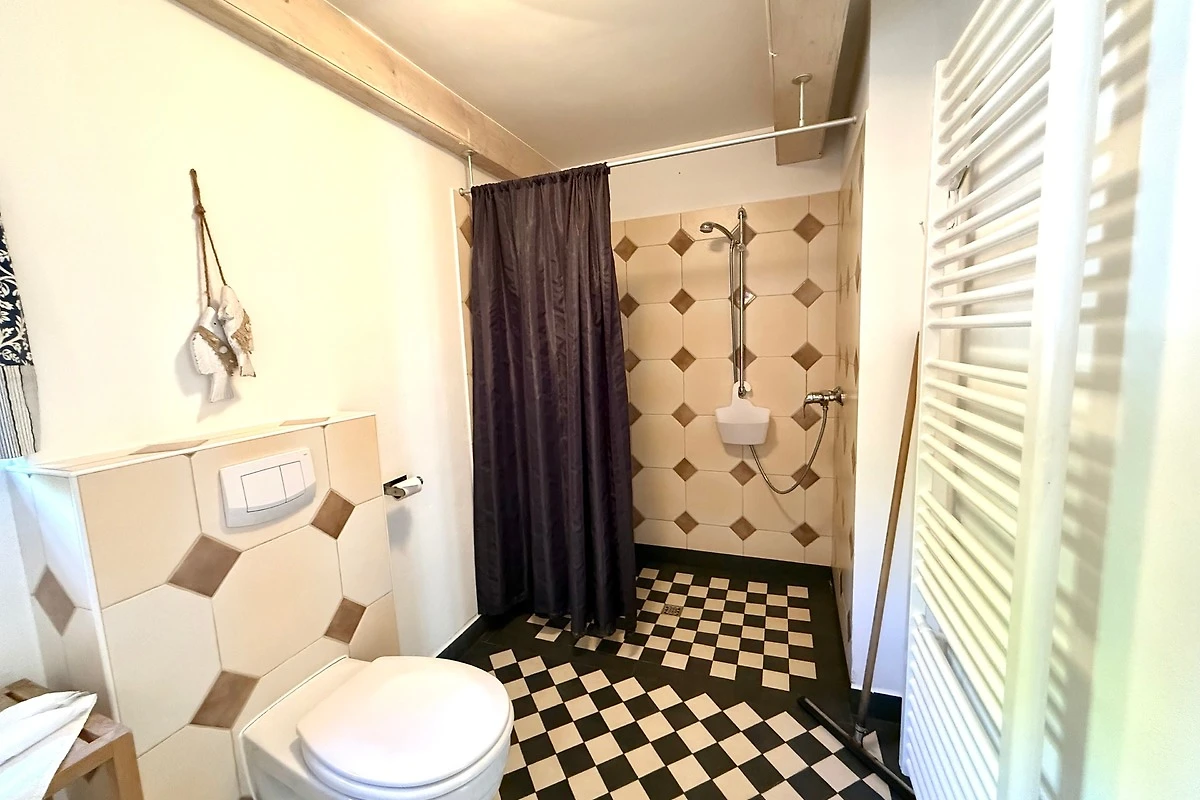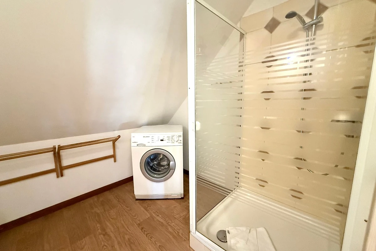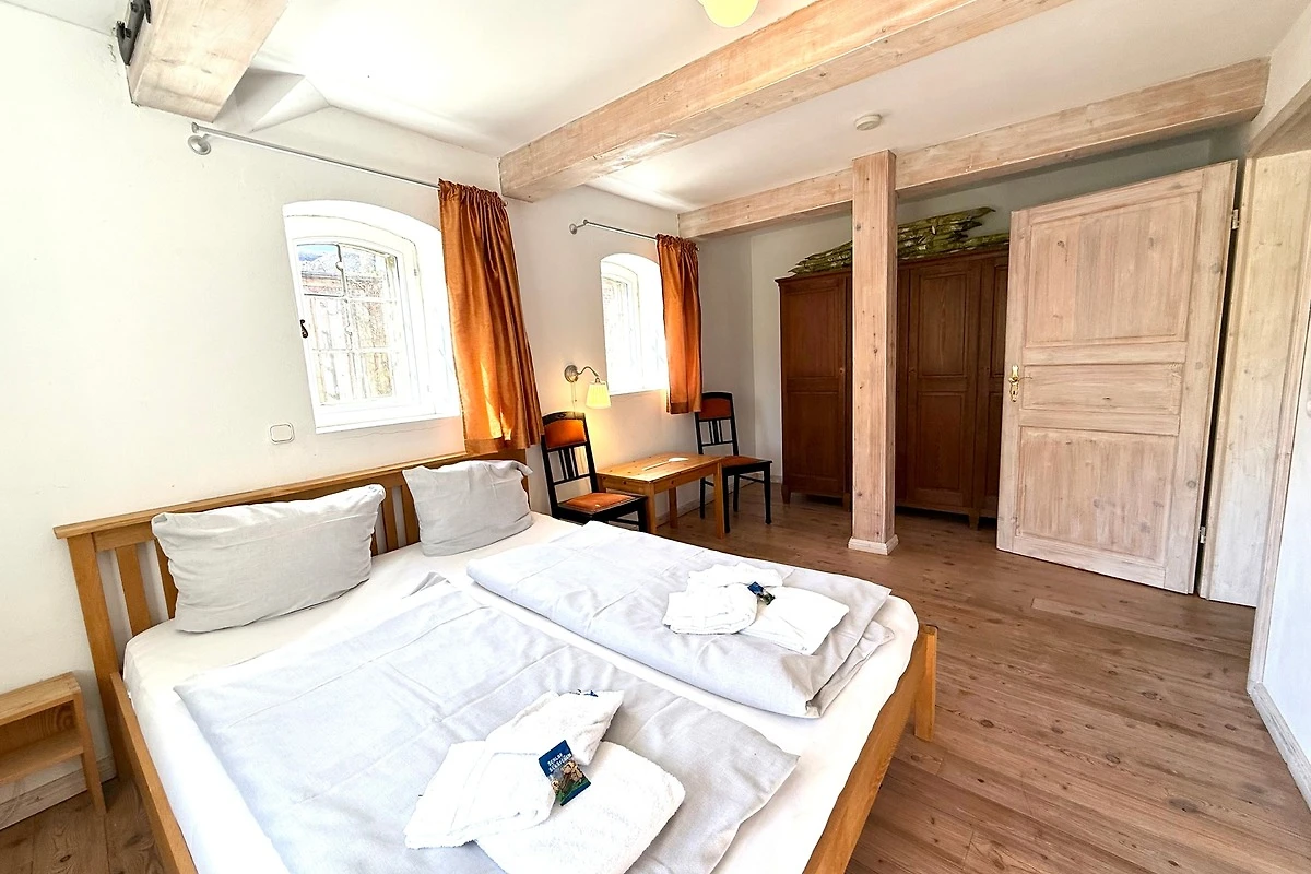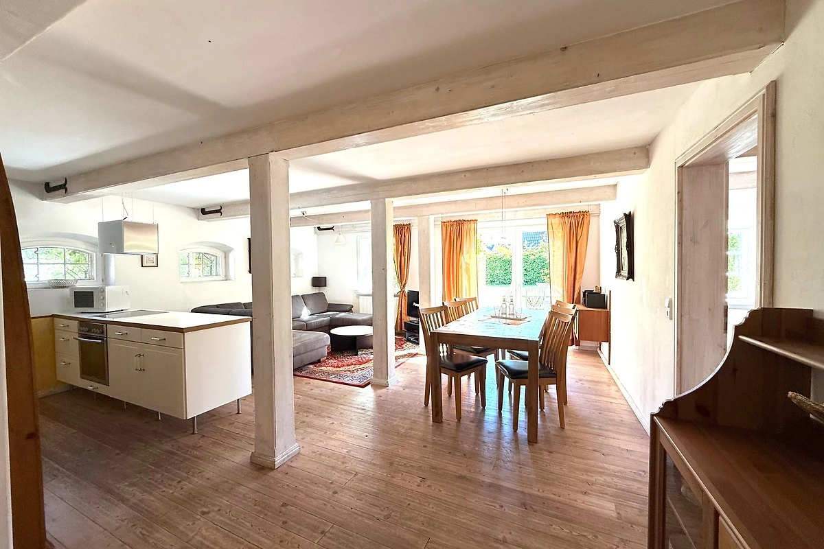 Der ehemalige Stallteil ist neu ausgebaut mit sichtbaren Deckenbalken und Stützen. Diese Wohnung für 7 Personen ist im alten Stall modern eingerichtet. Im offenen Wohn/Essbereich befindet sich auch die moderne Küche mit Spülmaschine und freistehendem Kochbereich. Das grosse, behindertenfreundliche Bad mit bodengleicher Dusche und ein Schlafzimmer befinden sich im Erdgeschoss. Im Dachgeschoss finden Sie zwei Schlafzimmer und ein Duschbad mit Waschmaschine. Ein Kinderbett steht im Elternschlafbereich. Das Kinderzimmer bietet 3 getrennte Betten.