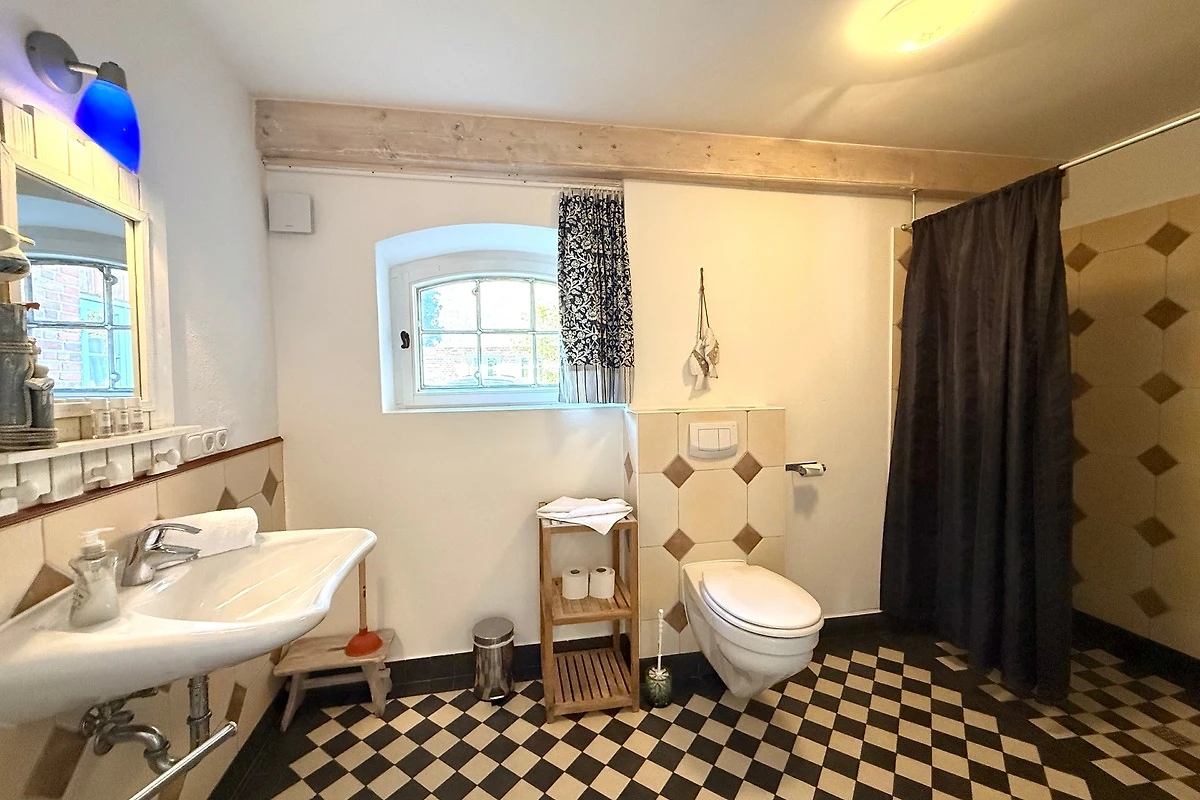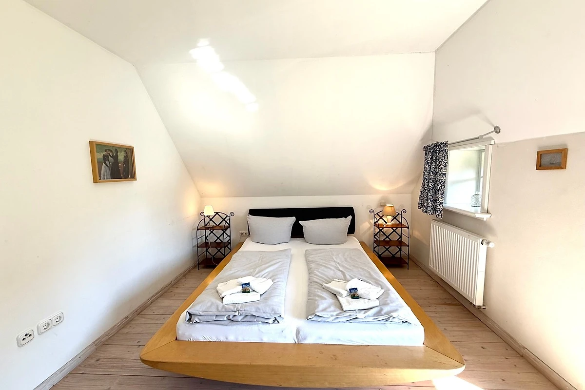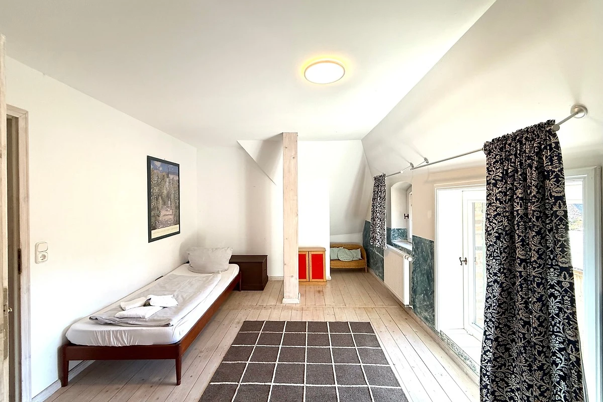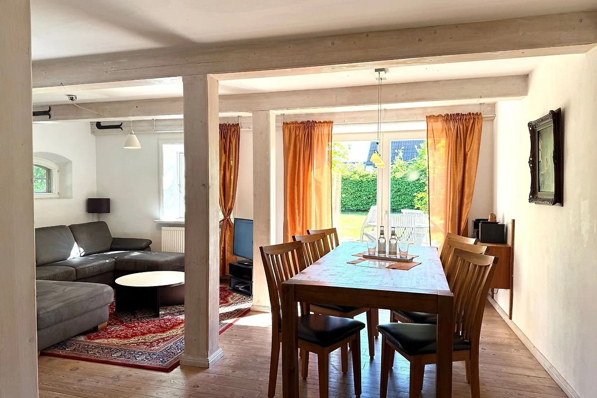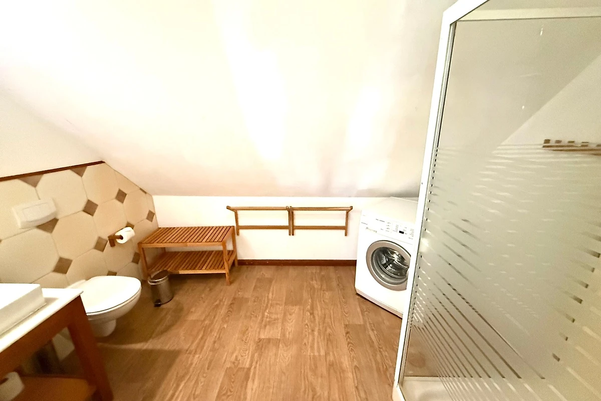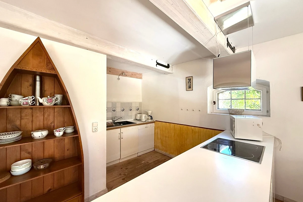 Der ehemalige Stallteil ist neu ausgebaut mit sichtbaren Deckenbalken und Stützen. Diese Wohnung für 7 Personen ist im alten Stall modern eingerichtet. Im offenen Wohn/Essbereich befindet sich auch die moderne Küche mit Spülmaschine und freistehendem Kochbereich. Das grosse, behindertenfreundliche Bad mit bodengleicher Dusche und ein Schlafzimmer befinden sich im Erdgeschoss. Im Dachgeschoss finden Sie zwei Schlafzimmer und ein Duschbad mit Waschmaschine. Ein Kinderbett steht im Elternschlafbereich. Das Kinderzimmer bietet 3 getrennte Betten.