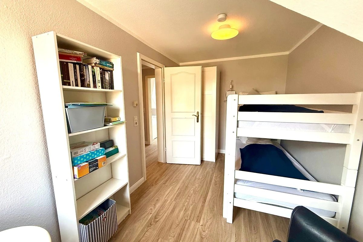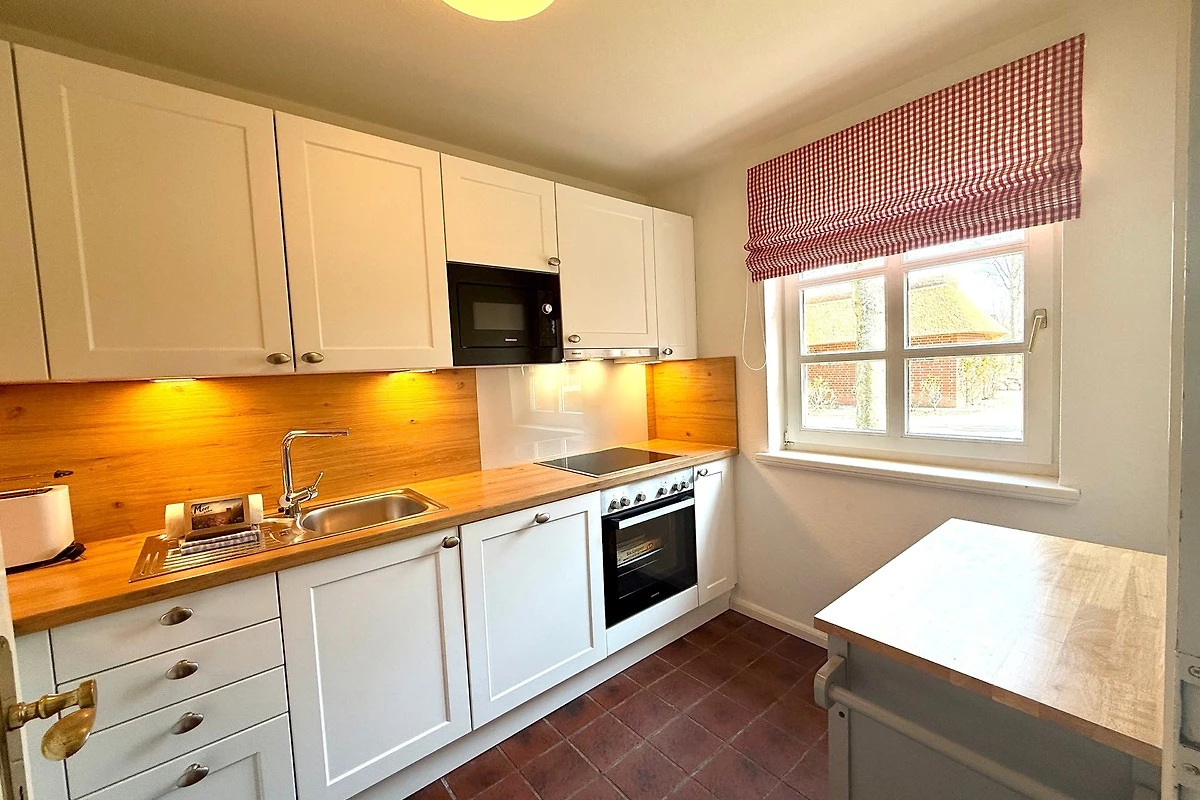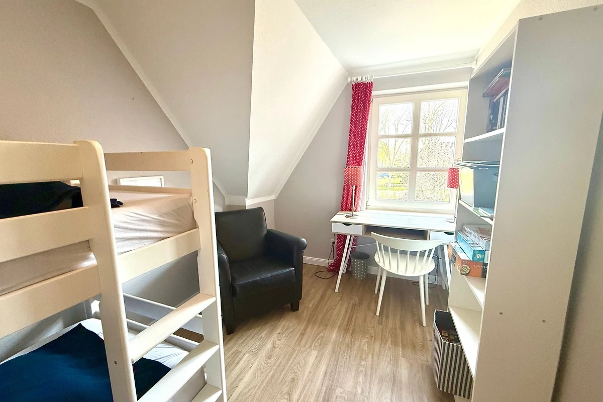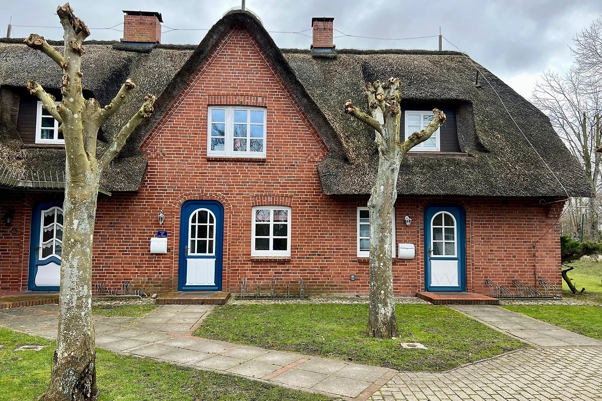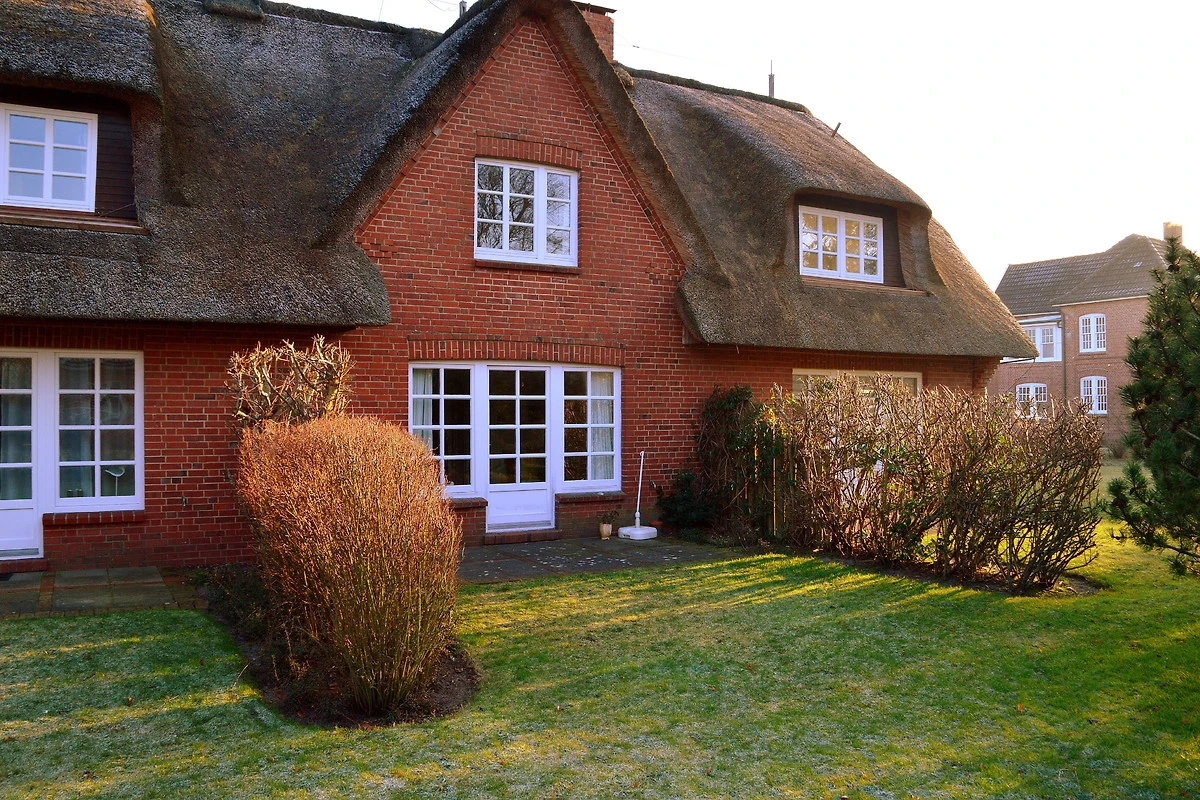 Im Dezember 2017 wurde das Haus Friesenfeuer für seine Feriengäste komplett neu ausgestattet. Auf einem sonnigen und grossen Gemeinschaftsgrundstück gelegen, erstreckt sich das reedgedeckte Reihenmittelhaus über 85 Quadratmeter Wohnfläche auf zwei Etagen und bietet Platz für vier Personen plus Kleinkind. Es verfügt im Erdgeschoss über einen grosszügigen und gemütlichen Wohn- und Essbereich, eine separate vollausgestattete Küche und ein geräumiges Badezimmer mit Dusche. Im Obergeschoss befindet sich ein grosses Schlafzimmer mit Doppelbett, ein Kinderzimmer mit Etagenbett und ein weiteres Badezimmer mit Badewanne und kostenfrei nutzbarer Waschmaschine. Der ausgebaute Dachbereich kann als Abstellraum oder Spielzimmer für Kinder genutzt werden. Die sonnige Südwestterrasse mit zugehörigem gepflegten Garten lädt zum Verweilen ein. Ein Kfz-Stellplatz sowie eine geschützte Abstellmöglichkeit für Fahrräder befinden sich ebenfalls auf dem Grundstück.
