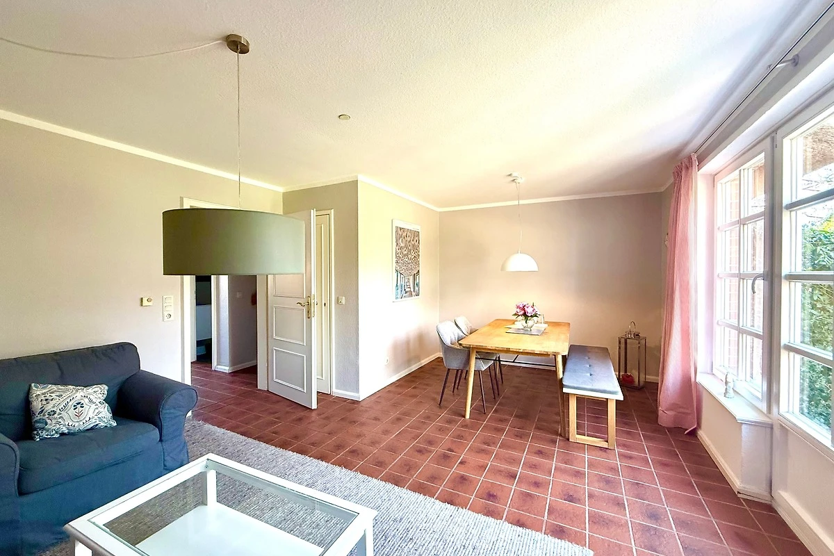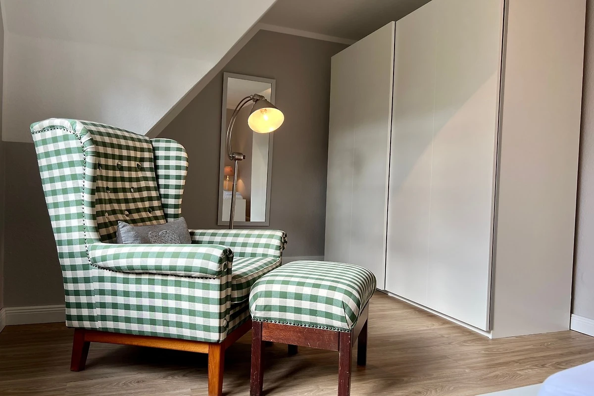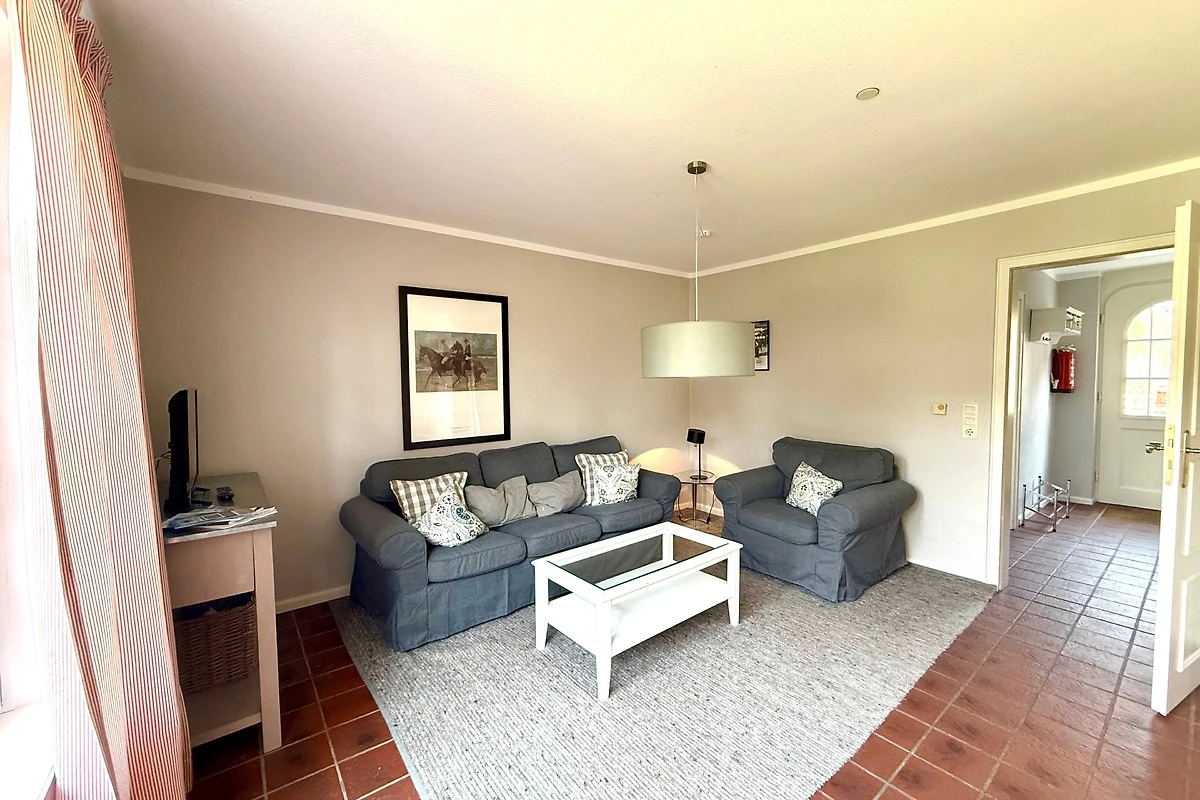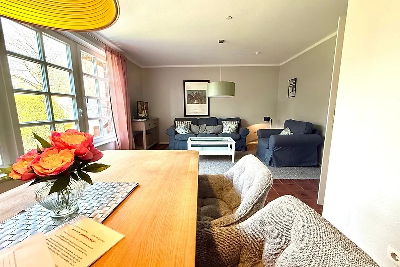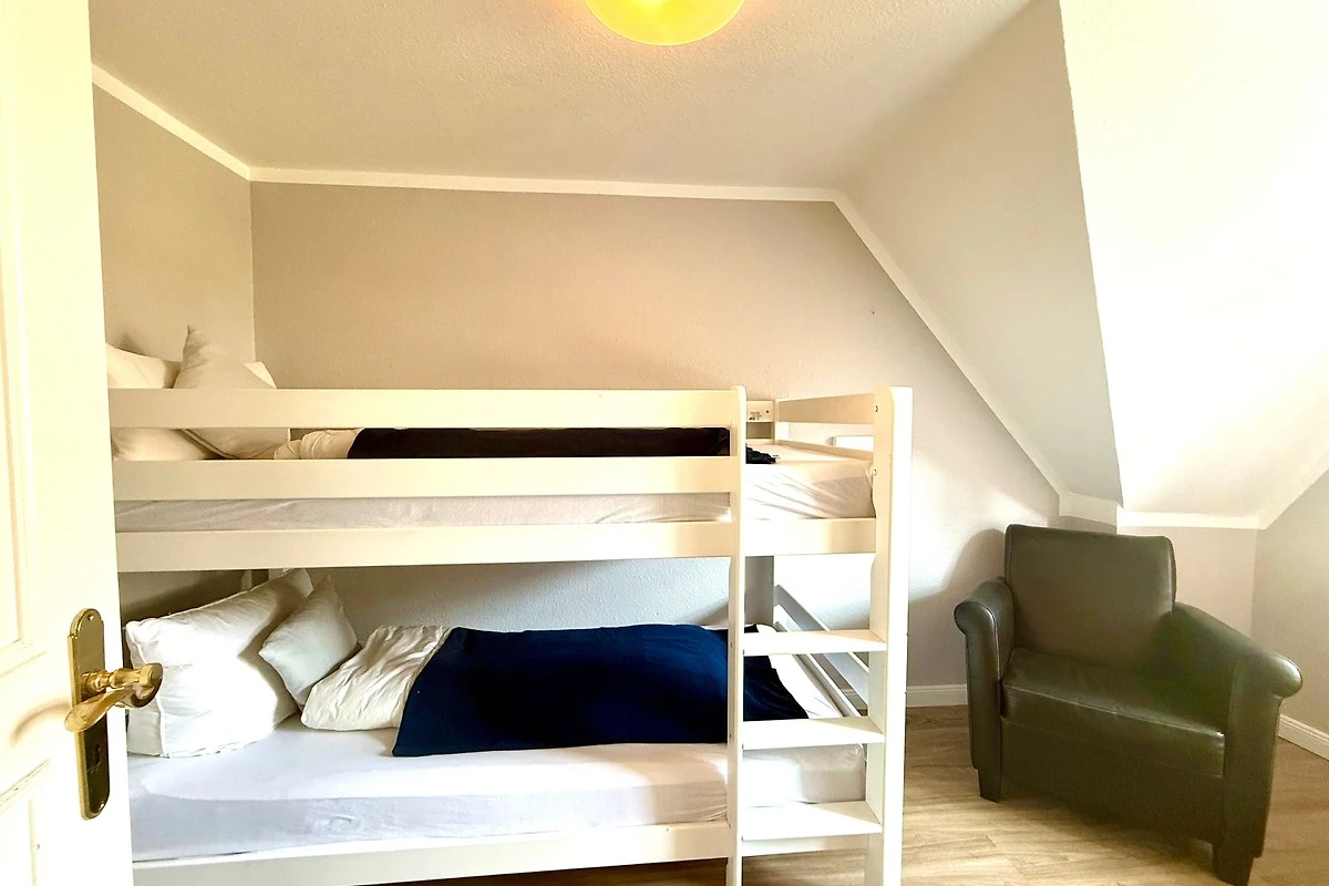 Im Dezember 2017 wurde das Haus Friesenfeuer für seine Feriengäste komplett neu ausgestattet. Auf einem sonnigen und grossen Gemeinschaftsgrundstück gelegen, erstreckt sich das reedgedeckte Reihenmittelhaus über 85 Quadratmeter Wohnfläche auf zwei Etagen und bietet Platz für vier Personen plus Kleinkind. Es verfügt im Erdgeschoss über einen grosszügigen und gemütlichen Wohn- und Essbereich, eine separate vollausgestattete Küche und ein geräumiges Badezimmer mit Dusche. Im Obergeschoss befindet sich ein grosses Schlafzimmer mit Doppelbett, ein Kinderzimmer mit Etagenbett und ein weiteres Badezimmer mit Badewanne und kostenfrei nutzbarer Waschmaschine. Der ausgebaute Dachbereich kann als Abstellraum oder Spielzimmer für Kinder genutzt werden. Die sonnige Südwestterrasse mit zugehörigem gepflegten Garten lädt zum Verweilen ein. Ein Kfz-Stellplatz sowie eine geschützte Abstellmöglichkeit für Fahrräder befinden sich ebenfalls auf dem Grundstück.