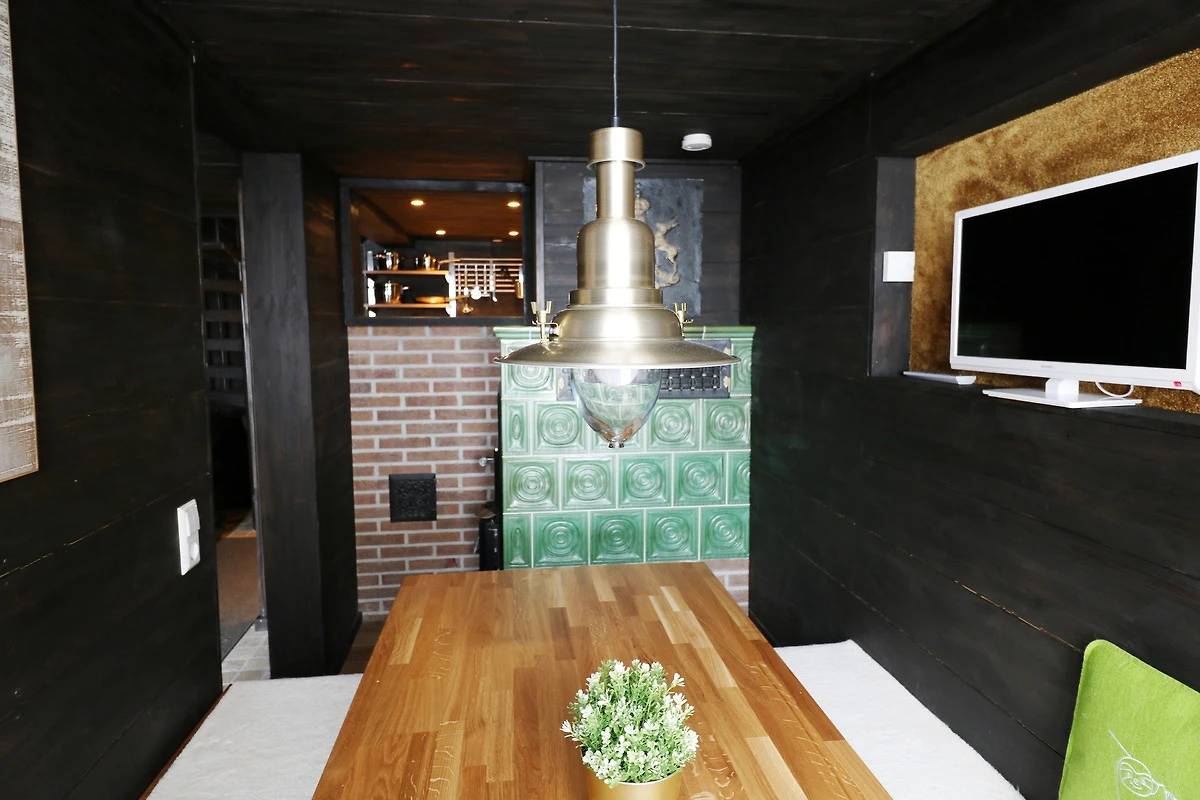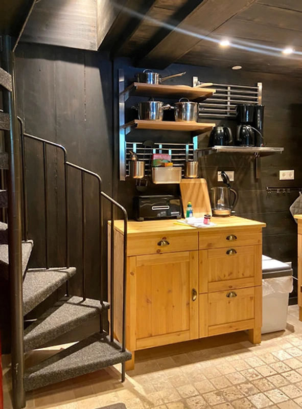Im Erdgeschoss des Ferienhauses befindet sich eine kleine Küche und ein gemütlicher Essplatz .