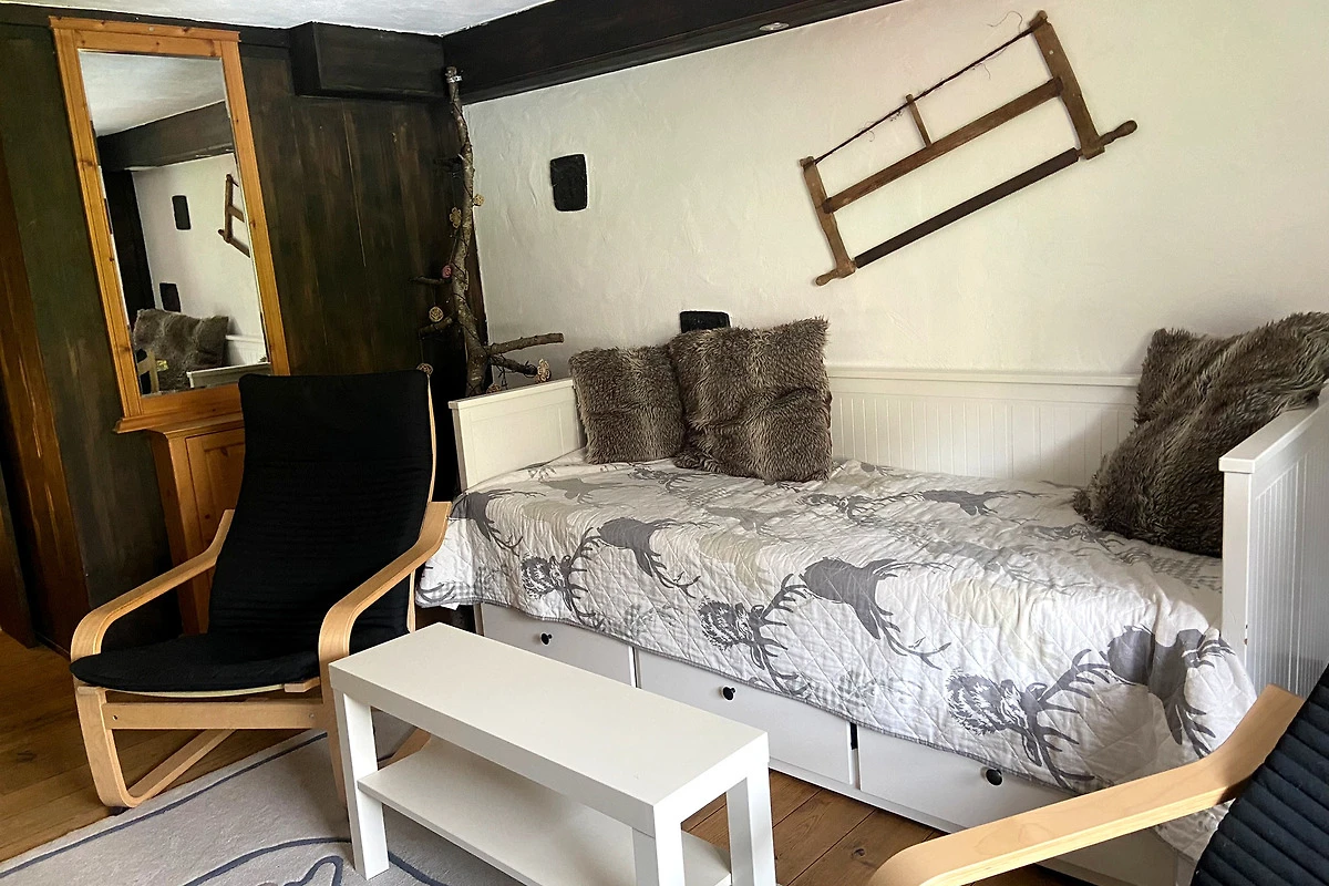 Über eine schmale Wendeltreppe erreichen Sie das gemütliche Wohnzimmer mit ausziehbarer Schlafcouch und TV.