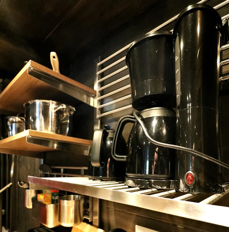 Die Küche ist mit einem Herd mit 4 Kochplatten, einem Backofen, einem Kühlschrank mit Gefrierfach, einem Toaster, einem Wasserkocher und einer Kaffeemaschine ausgestattet.