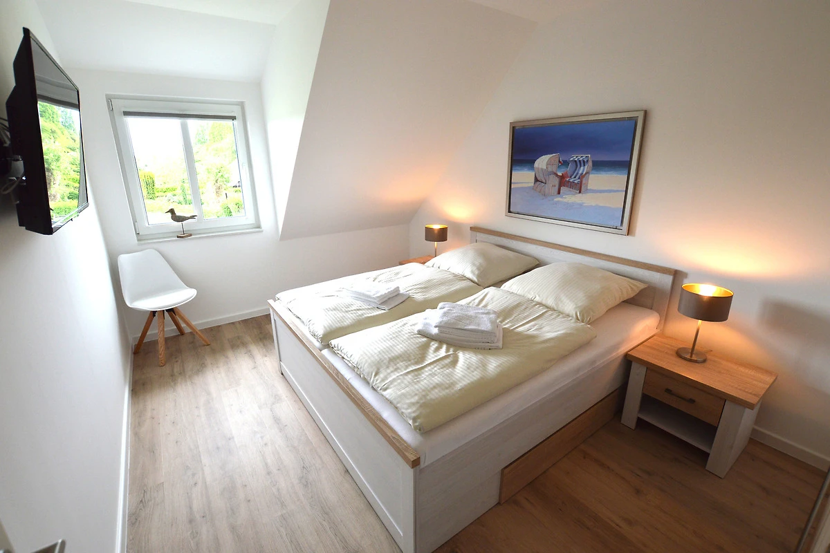 Im Obergeschoss befinden sich die zwei Schlafzimmer mit Doppelbetten, sowie ein kleines Zimmer für ein Gitterbett.