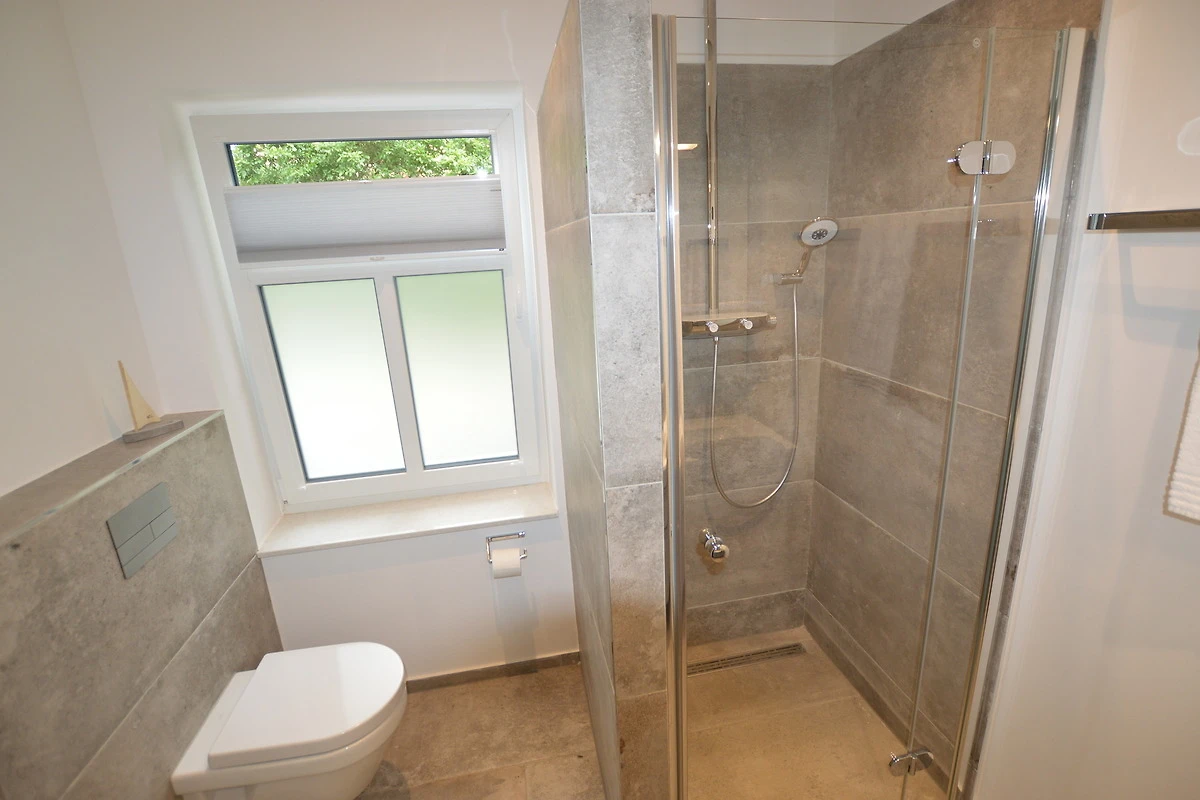 Ihre Sauna ist durch Ihr ansprechendes Duschbad erreichbar.