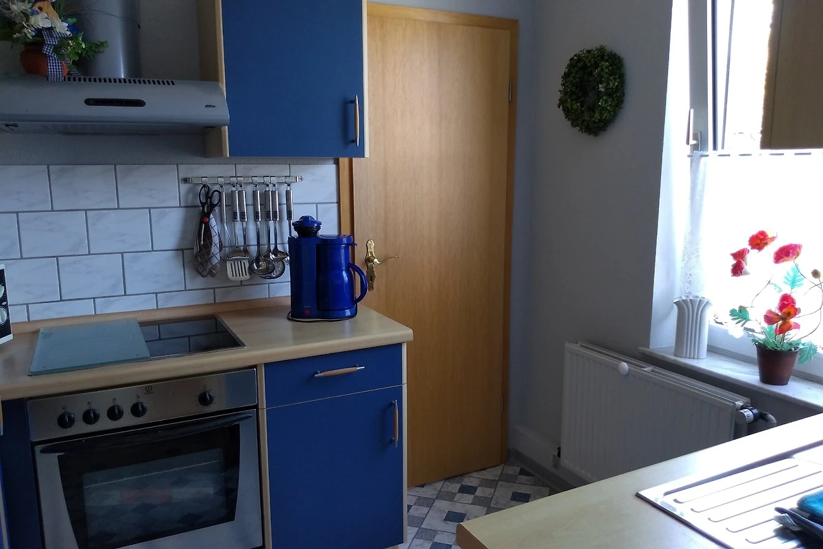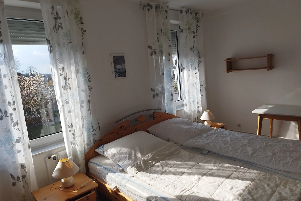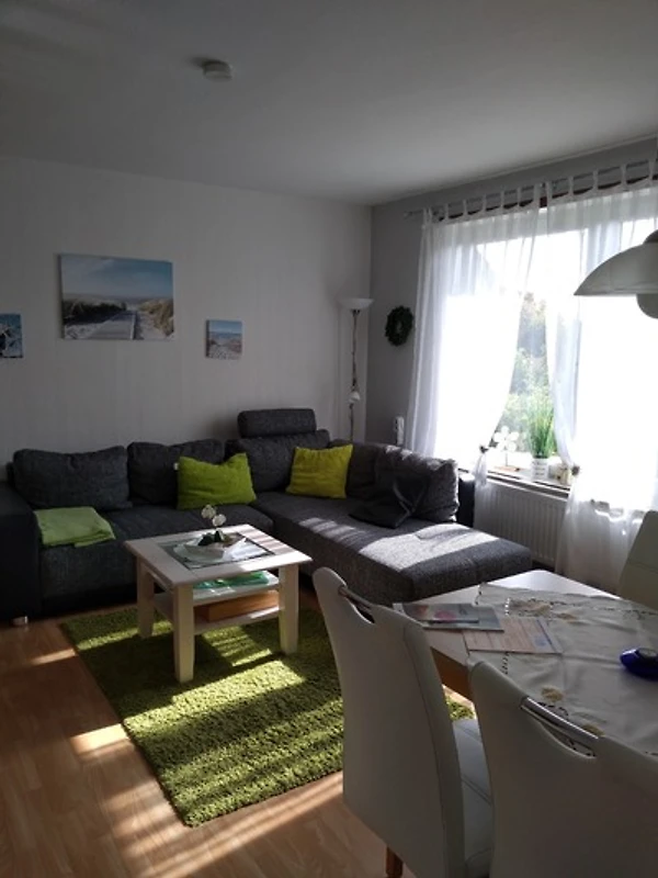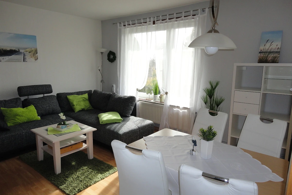 Wohnzimmer bei 2 Pers. oder Wohnschlafraum bei 3 Pers. Ecksofa mit Schlaffunktion, . Essecke. Sat TV Flachbildschirm, Stereoanlage m. CD Spiele, Bücher. Schlafzimmer: Doppelbett (200x180), 1 Kinder- Gitterbett (140x70) Aussenrollladen.