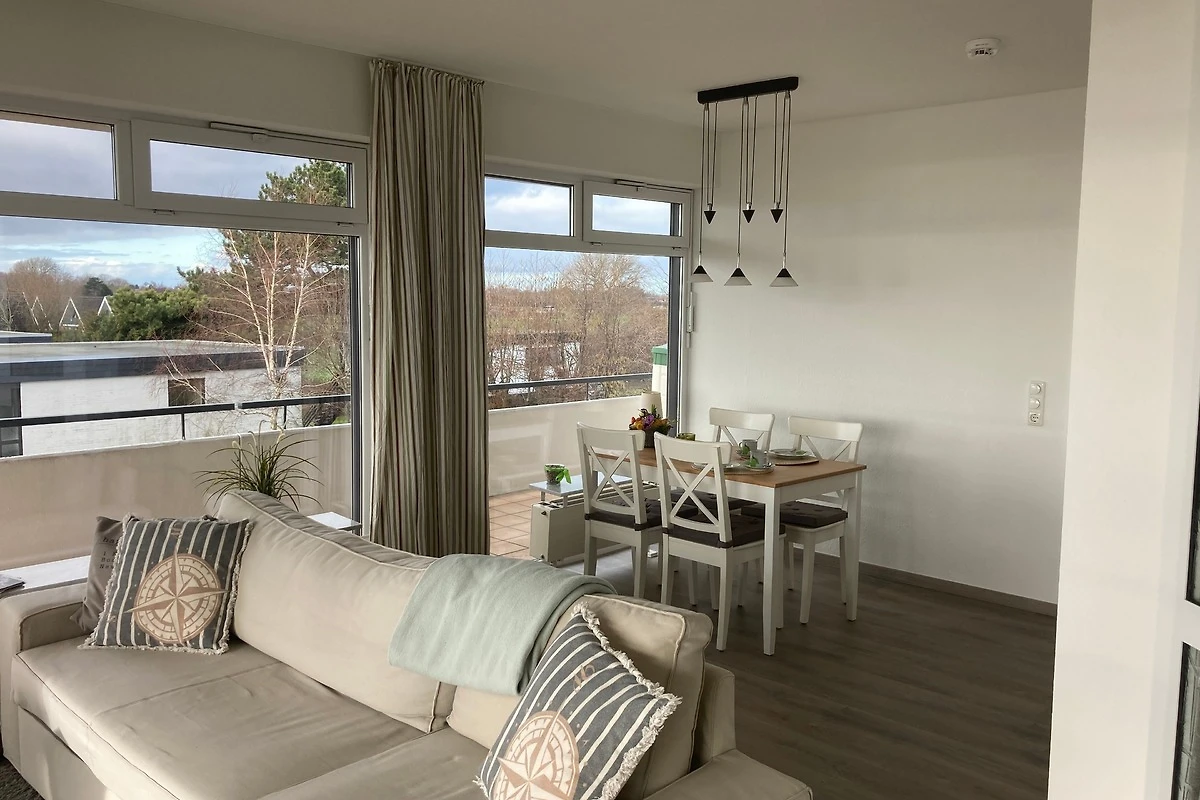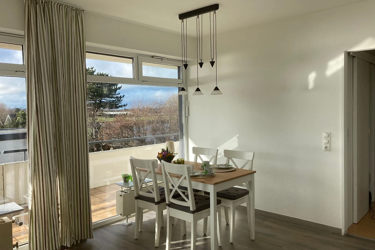 Die wunderschöne Wohnung bietet optimalen Komfort für 2 Personen. Bei schönem Wetter lädt der grosse Eck-Balkon zum Relaxen ein. Bei Regen und Sturm können Sie den aufregenden Blick auf das aufgewühlte Meer direkt von der gemütlichen Couchgarnitur durch die grosse Glasfront geniessen. Zum Naturstrand sind es nicht einmal 100 m, zum feinsandigen Kurstrand mit Strandkörben und Gastronomie ca. 500 m. Die hervorragende Ausstattung sorgt dafür, dass Sie sich sofort wohl fühlen. Die Küche ist mit Geschirrspülmaschine, Mikrowelle, Backofen und vielen weiteren Küchenutensilien perfekt eingerichtet. Sie schlafen in einem separaten Schlafzimmer - liebevoll Schlafkoje genannt (2 Betten 90 x 200) -. Im Flur befindet sich ein geräumiger Kleiderschrank, mit ausreichendem Stauraum.