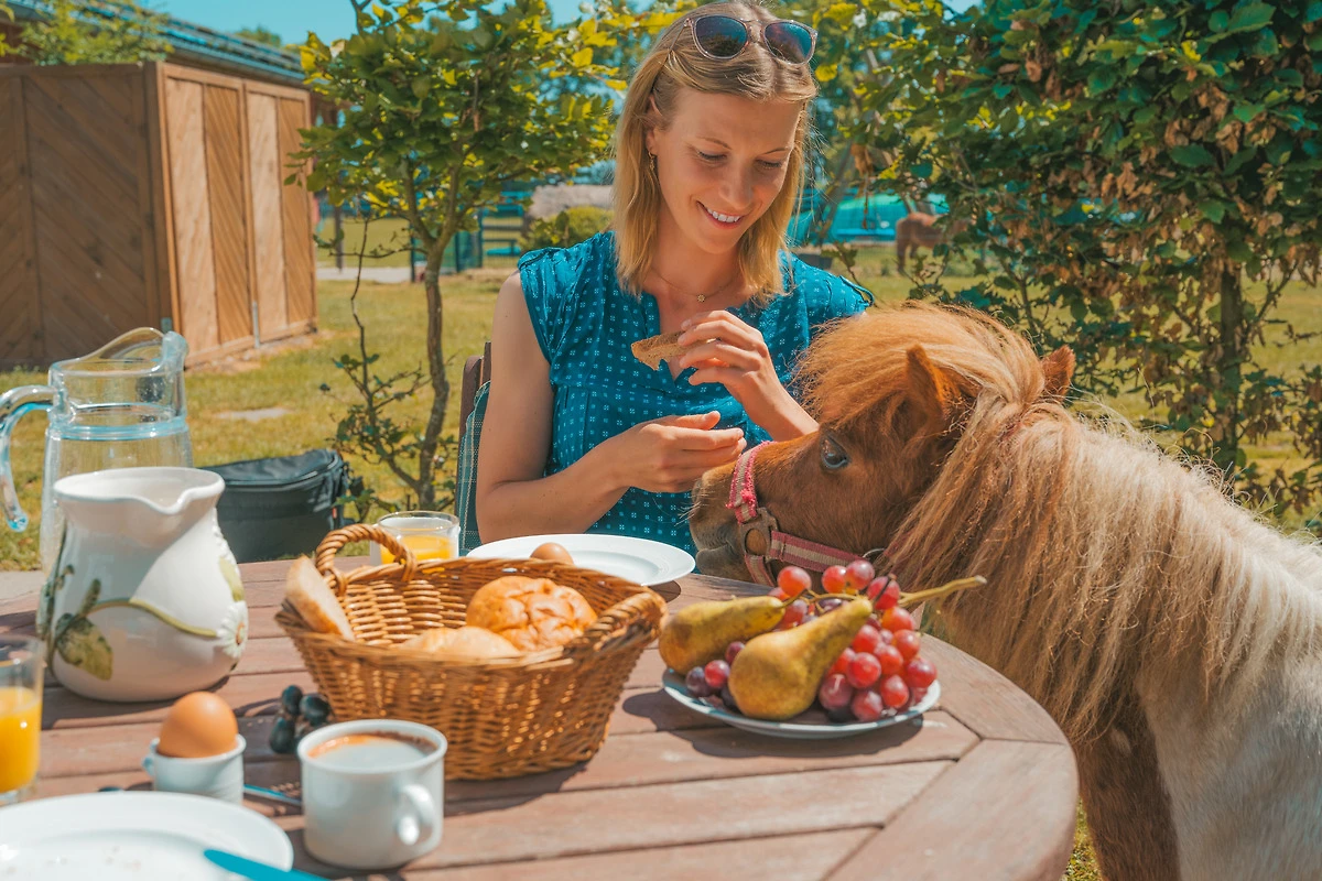 Eine beliebte Attraktion für unsere kleinen Gästen sind die Tiere: Mini-Schweine, Kaninchen, Hühner, Meerschweinchen, Schafe, Ziegen sowie 8 Ponys und Pferde, mit denen i.d.R. zweimal am Tag ausgeritten wird.