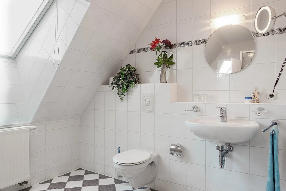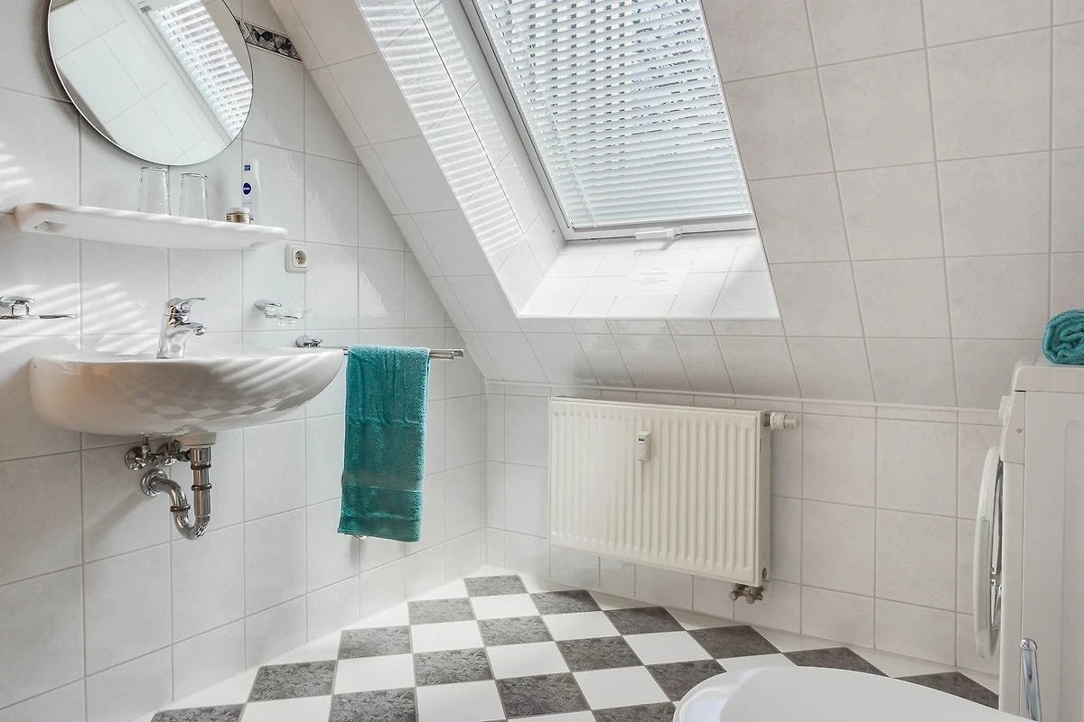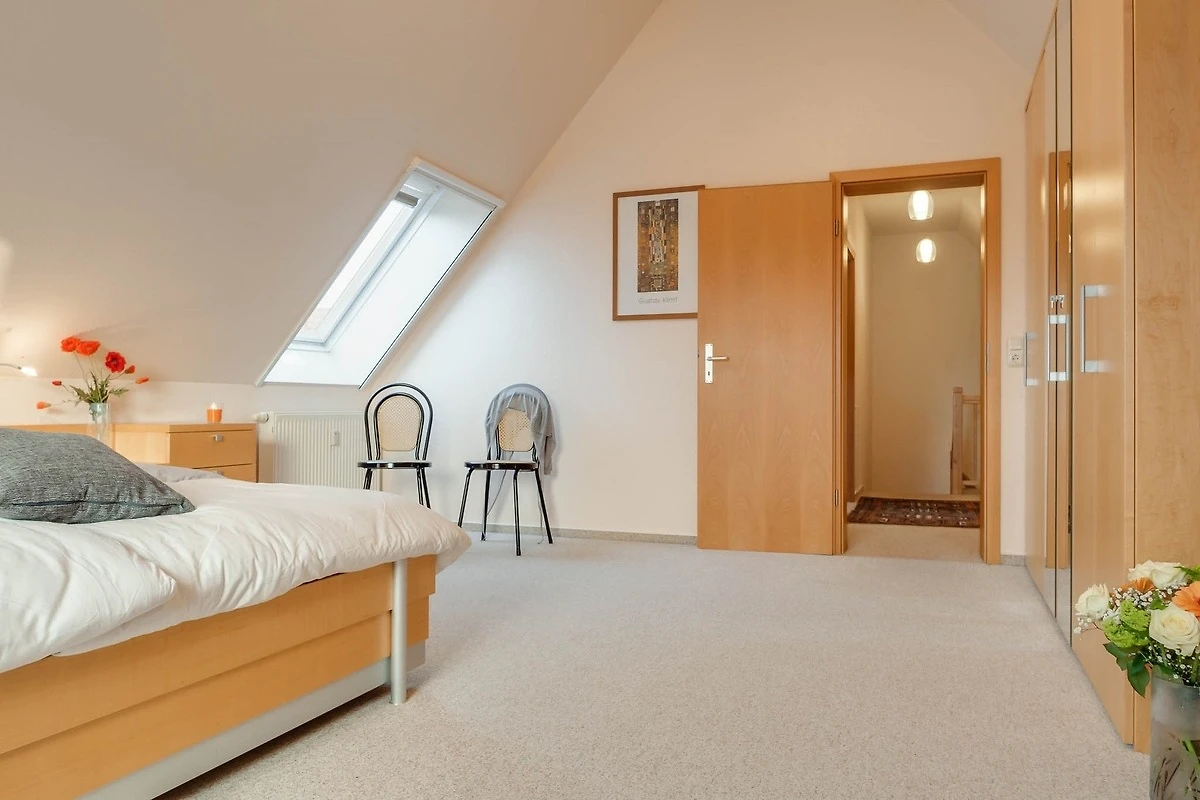 In der 2.Etage befinden sich 2 grosse Schlafräume ( 2 x 1 Doppelbett ), 1 Balkon (Südlage) und 1 Bad mit Dusche, Badewanne und WC.