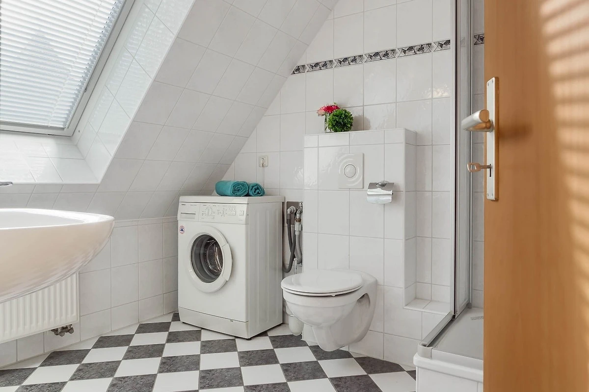 In der 1. Etage befindet sich ein Wohn- Essbereich mit grossem Südbalkon (Gartenmöbel) und einer Küchenzeile (Spülmaschine, Kühlschrank mit Gefrierfach, Herd mit Backofen, Mikrowelle, Kaffeemaschine, Wasserkocher, Toaster ...) und ein Bad mit Dusche, WC und Waschmaschine.